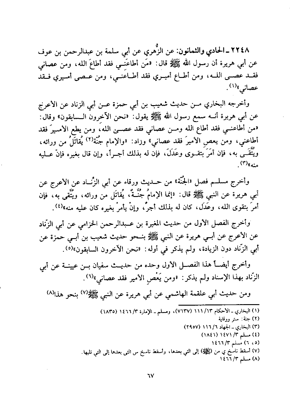 2248 - الْحَادِي وَالثَّمَانُونَ: عَن الزُّهْرِيّ عَن أبي سَلمَة بن عبد الرَّحْمَن بن عَوْف عَن أبي هُرَيْرَة أَن رَسُول الله صلى الله عَلَيْهِ وَسلم قَالَ: " من أَطَاعَنِي فقد أطَاع الله، وَمن عَصَانِي فقد عصى الله، وَمن أطَاع أَمِيري فقد أَطَاعَنِي، وَمن عصى أَمِيري فقد عَصَانِي ".