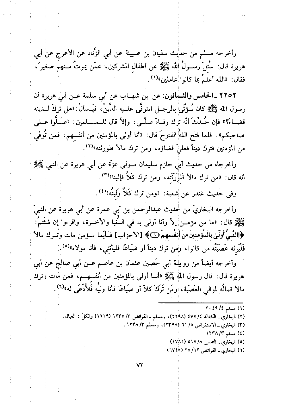 2252 - الْخَامِس وَالثَّمَانُونَ: عَن ابْن شهَاب عَن أبي سَلمَة عَن أبي هُرَيْرَة أَن رَسُول الله صلى الله عَلَيْهِ وَسلم كَانَ يُؤْتى بِالرجلِ الْمُتَوفَّى عَلَيْهِ الدّين، فَيسْأَل: " هَل ترك لدينِهِ قَضَاء؟ " فَإِن حدث أَنه ترك وَفَاء صلى، وَإِلَّا قَالَ للْمُسلمين: " صلوا على صَاحبكُم ". فَلَمَّا فتح الله الْفتُوح قَالَ: " أَنا أولى بِالْمُؤْمِنِينَ من أنفسهم، فَمن توفّي من الْمُؤمنِينَ فَترك دينا فعلي قَضَاؤُهُ، وَمن ترك مَالا فلورثته ".