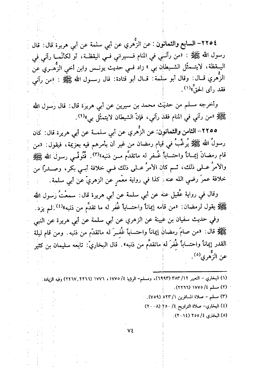 2255 - الثَّامِن وَالثَّمَانُونَ: عَن الزُّهْرِيّ عَن أبي سَلمَة عَن أبي هُرَيْرَة قَالَ: كَانَ رَسُول الله صلى الله عَلَيْهِ وَسلم يرغب فِي قيام رَمَضَان من غير أَن يَأْمُرهُم فِيهِ بعزيمة، فَيَقُول: " من قَامَ رَمَضَان إِيمَانًا واحتساباً غفر لَهُ مَا تقدم من ذَنبه ". فَتوفي رَسُول الله صلى الله عَلَيْهِ وَسلم وَالْأَمر على ذَلِك، ثمَّ كَانَ الْأَمر على ذَلِك فِي خلَافَة أبي بكر، وصدراً من خلَافَة عمر رَضِي الله عَنهُ. كَذَا فِي رِوَايَة معمرٍ عَن الزُّهْرِيّ عَن أبي سَلمَة.