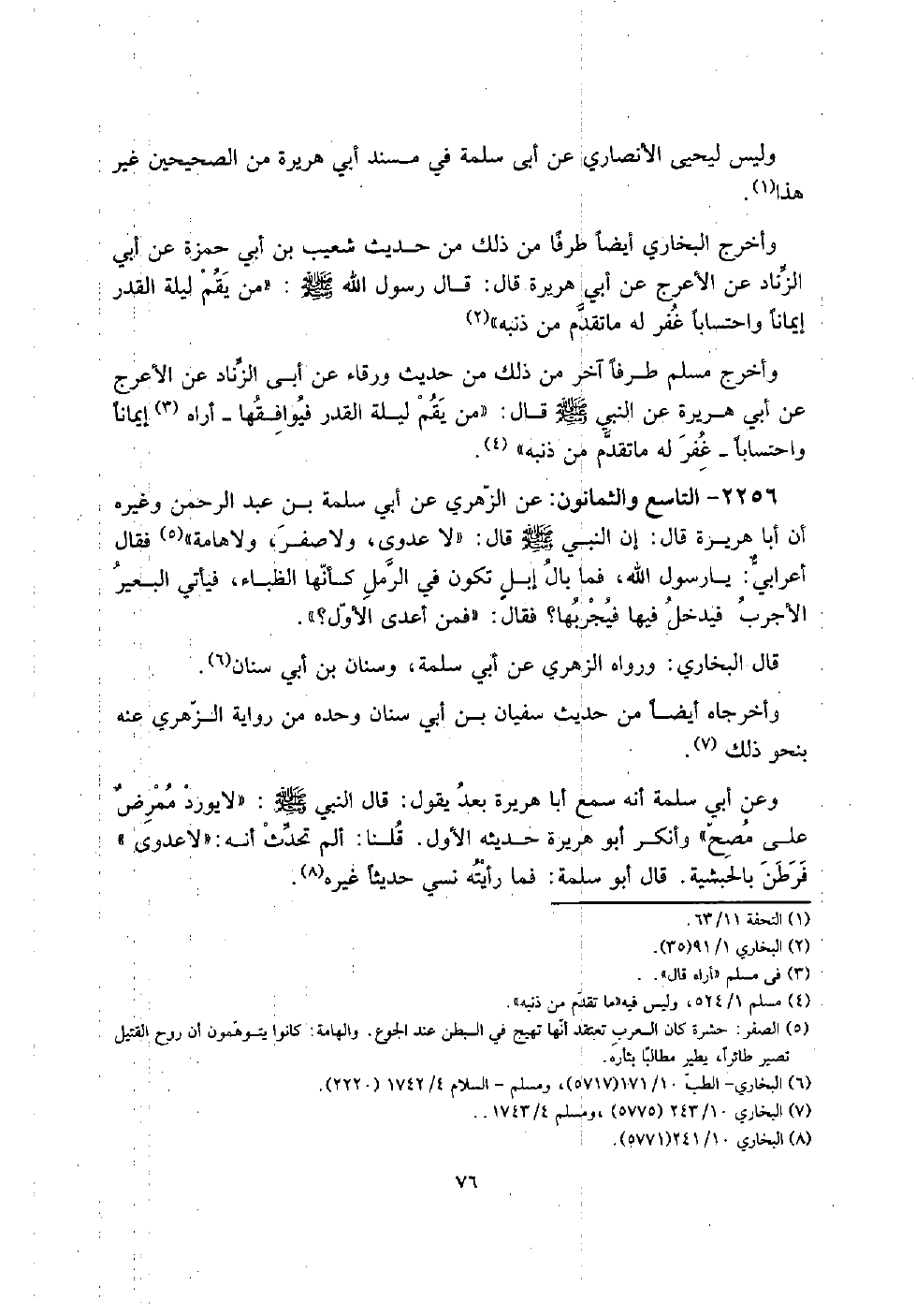 2256 - التَّاسِع وَالثَّمَانُونَ: عَن الزُّهْرِيّ عَن أبي سَلمَة بن عبد الرَّحْمَن وَغَيره أَن أَبَا هُرَيْرَة قَالَ: إِن النَّبِي صلى الله عَلَيْهِ وَسلم قَالَ: " لَا عدوى، وَلَا صفر، وَلَا هَامة " فَقَالَ أعرابيٌّ: يَا رَسُول الله، فَمَا بَال إبلٍ تكون فِي الرمل كَأَنَّهَا الظباء، فَيَأْتِي الْبَعِير الأجرب فَيدْخل فِيهَا فيجربها؟ فَقَالَ: " فَمن أعدى الأول؟ ".