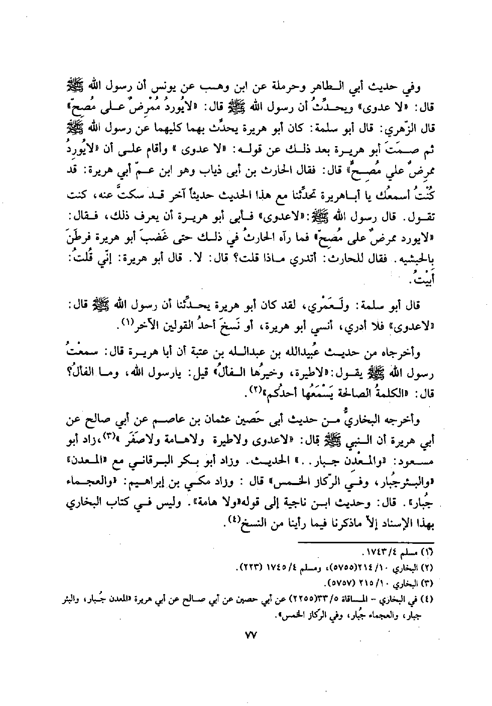 لَا عدوى " وَيحدث أَن رَسُول الله صلى الله عَلَيْهِ وَسلم قَالَ: " لَا يُورد ممرضٌ على مصح " قَالَ الزُّهْرِيّ: قَالَ أَبُو سَلمَة: كَانَ أَبُو هُرَيْرَة يحدث بهما كليهمَا عَن رَسُول الله صلى الله عَلَيْهِ وَسلم ثمَّ صمت أَبُو هُرَيْرَة بعد ذَلِك عَن قَوْله: " لَا عدوى " وَأقَام على أَن " لَا يُورد ممرضٌ عَليّ مصحٍّ " قَالَ: فَقَالَ الْحَارِث بن أبي ذياب وَهُوَ ابْن عَم أبي هُرَيْرَة: قد كنت أسمعك يَا أَبَا هُرَيْرَة تحدثنا مَعَ هَذَا الحَدِيث حَدِيثا آخر قد سكت عَنهُ، كنت تَقول. قَالَ رَسُول الله صلى الله عَلَيْهِ وَسلم: " لَا عدوى " فَأبى أَبُو هُرَيْرَة أَن يعرف ذَلِك، فَقَالَ: " لَا يُورد ممرضٌ على مصح " فَمَا رَآهُ الْحَارِث فِي ذَلِك حَتَّى غضب أَبُو هُرَيْرَة فرطن بالحبشية. فَقَالَ لِلْحَارِثِ: أَتَدْرِي مَاذَا قلت؟ قَالَ: لَا. قَالَ أَبُو هُرَيْرَة: إِنِّي قلت: أَبيت.