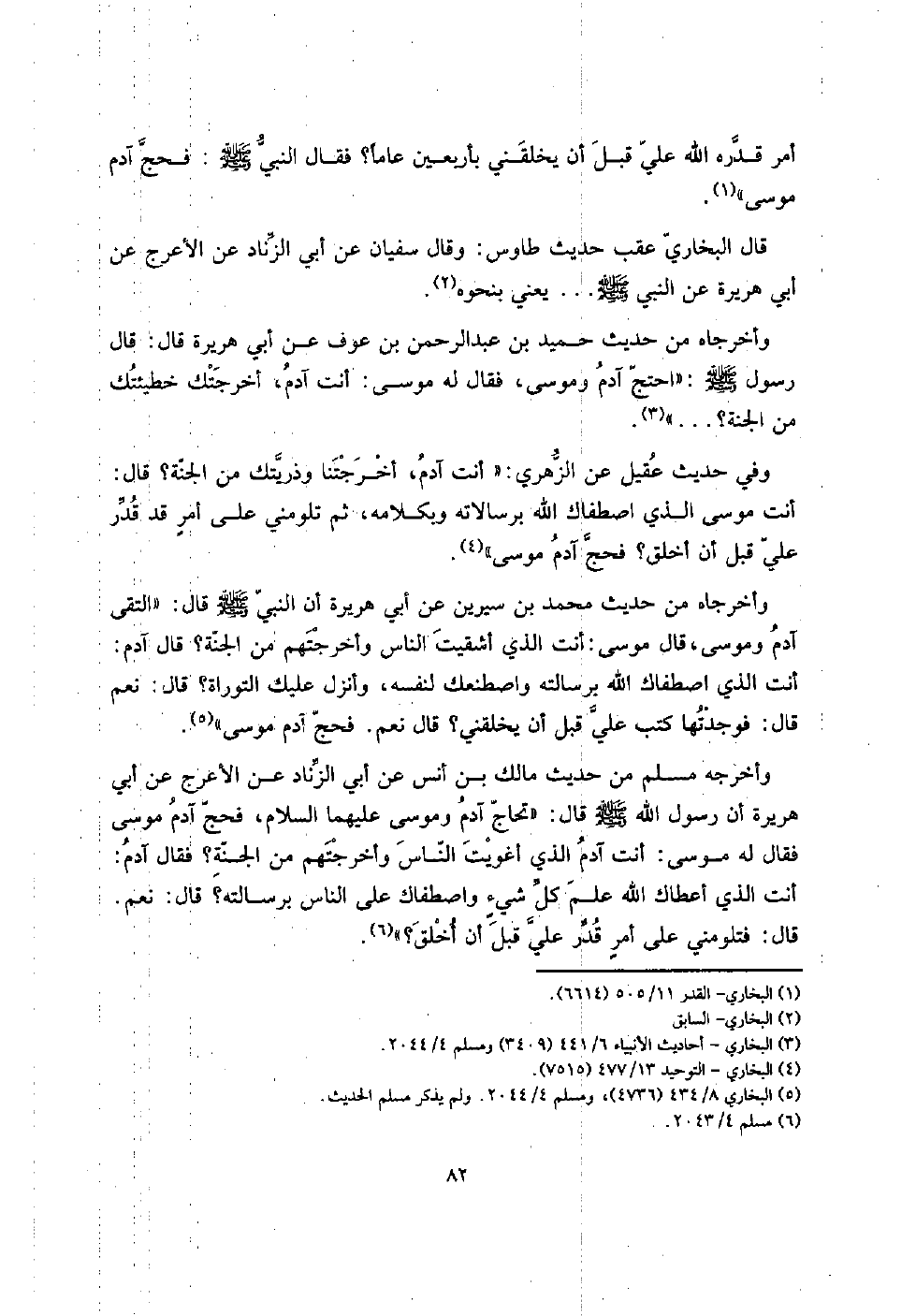 تحاج آدم ومُوسَى عَلَيْهِمَا السَّلَام، فحج آدم مُوسَى فَقَالَ لَهُ مُوسَى: أَنْت آدم الَّذِي أغويت النَّاس وأخرجتهم من الْجنَّة؟ فَقَالَ آدم: أَنْت الَّذِي أَعْطَاك الله علم كل شيءٍ واصطفاك على النَّاس برسالته؟ قَالَ: نعم. قَالَ: فتلومني على أمرٍ قدر عَليّ قبل أَن أخلق؟ ".