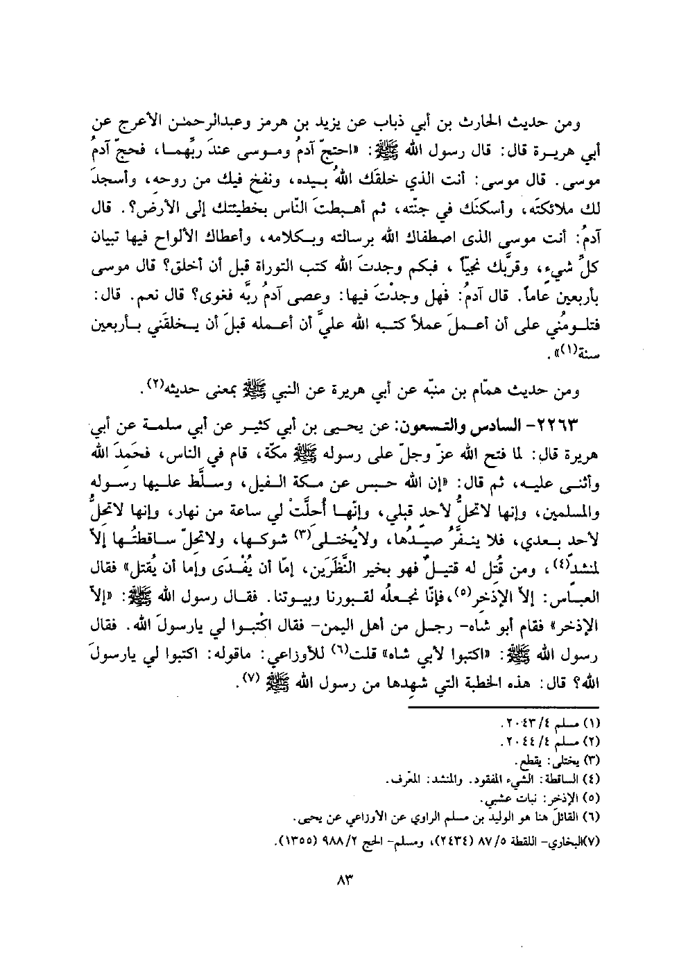 2263 - السَّادِس وَالتِّسْعُونَ: عَن يحيى بن أبي كثير عَن أبي سَلمَة عَن أبي هُرَيْرَة قَالَ: لما فتح الله عز وَجل على رَسُوله صلى الله عَلَيْهِ وَسلم مَكَّة، قَامَ فِي النَّاس، فَحَمدَ الله وَأثْنى عَلَيْهِ، ثمَّ قَالَ: " إِن الله حبس عَن مَكَّة الْفِيل، وسلط عَلَيْهَا رَسُوله وَالْمُسْلِمين، وَإِنَّهَا لَا تحل لأحدٍ قبلي، وَإِنَّهَا أحلّت لي سَاعَة من نَهَار، وَإِنَّهَا لَا تحل لأحدٍ بعدِي، فَلَا ينفر صيدها، وَلَا يخْتَلى شَوْكهَا، وَلَا تحل ساقطتها إِلَّا لمنشدٍ، وَمن قتل لَهُ قتيلٌ فَهُوَ بِخَير النظرين، إِمَّا أَن يفدى وَإِمَّا أَن يقتل " فَقَالَ الْعَبَّاس: إِلَّا الْإِذْخر، فَإنَّا نجعله لِقُبُورِنَا وَبُيُوتنَا. فَقَالَ رَسُول الله صلى الله عَلَيْهِ وَسلم: " إِلَّا رَسُول الله صلى الله عَلَيْهِ وَسلم: " اكتبوا لأبي شاه " قلت للأوزاعي: مَا قَوْله: اكتبوا لي يَا رَسُول الله؟ قَالَ: هَذِه الْخطْبَة الَّتِي شَهِدَهَا من رَسُول الله صلى الله عَلَيْهِ وَسلم