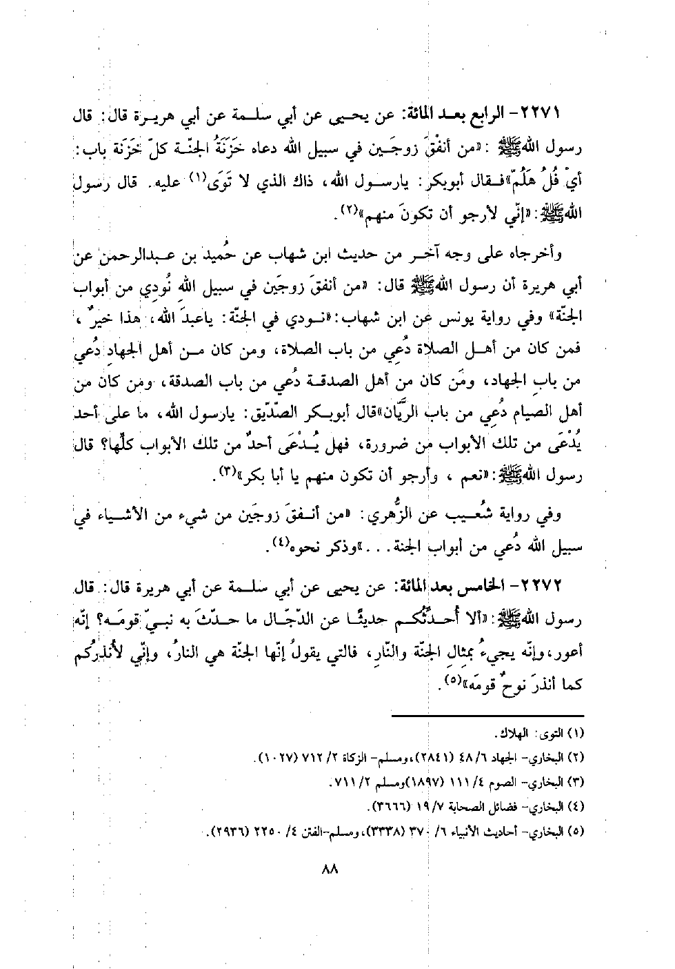 من أنْفق زَوْجَيْنِ فِي سَبِيل الله نُودي من أَبْوَاب الْجنَّة " وَفِي رِوَايَة يُونُس عَن ابْن شهَاب: " نُودي فِي الْجنَّة: يَا عبد الله، هَذَا خيرٌ، فَمن كَانَ من أهل الصَّلَاة دعِي من بَاب الصَّلَاة، وَمن كَانَ من أهل الْجِهَاد دعِي من بَاب الْجِهَاد، وَمن كَانَ من أهل الصَّدَقَة دعِي من بَاب الصَّدَقَة، وَمن كَانَ من أهل الصّيام دعِي من بَاب الريان " قَالَ أَبُو بكر الصّديق: يَا رَسُول الله، مَا على أحد يدعى من تِلْكَ الْأَبْوَاب من ضَرُورَة، فَهَل يدعى أحدٌ من تِلْكَ الْأَبْوَاب كلهَا؟ قَالَ رَسُول الله صلى الله عَلَيْهِ وَسلم: " نعم، وَأَرْجُو أَن تكون مِنْهُم يَا أَبَا بكر ".