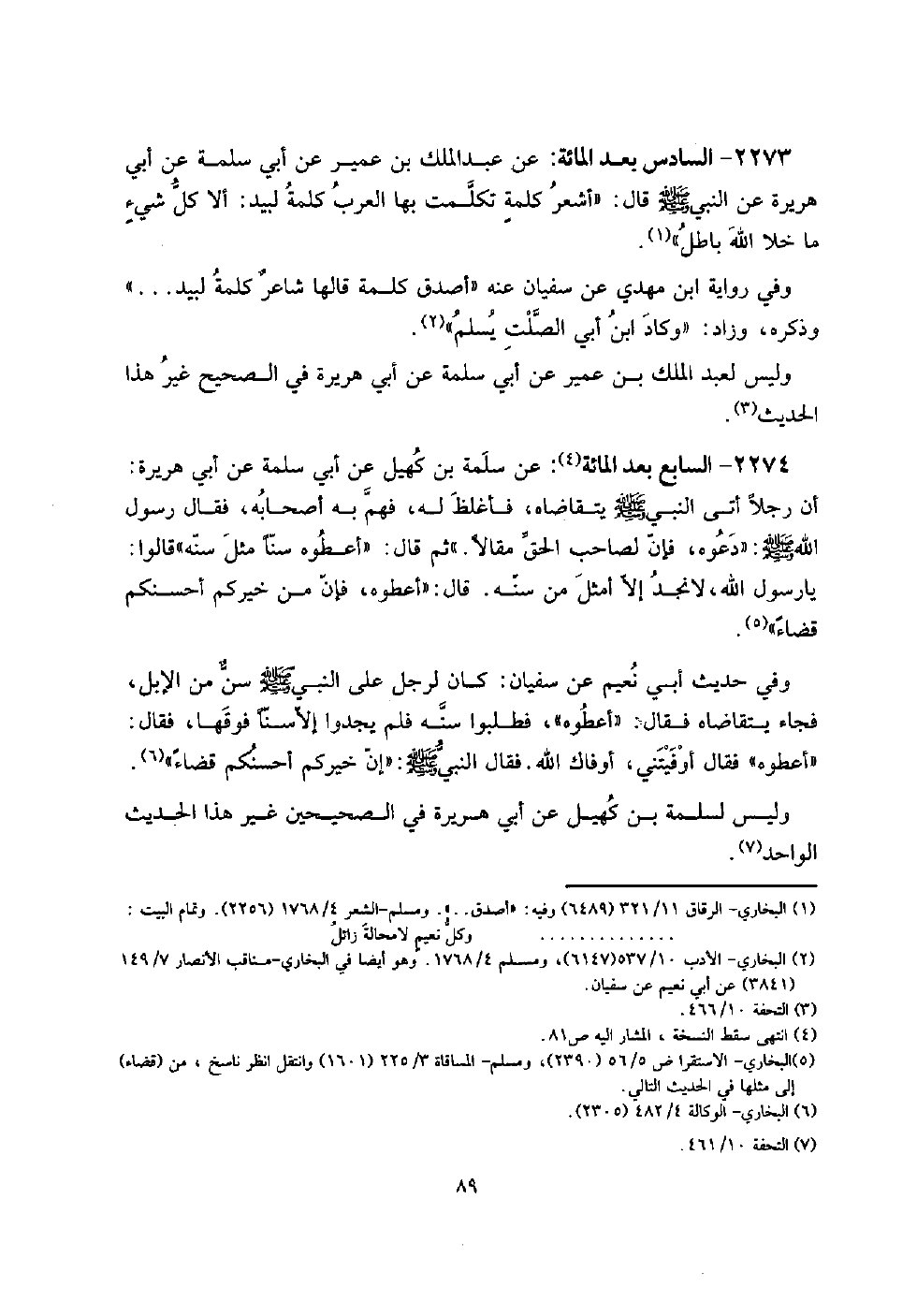 2273 - السَّادِس بعد الْمِائَة: عَن عبد الْملك بن عُمَيْر عَن أبي سَلمَة عَن أبي هُرَيْرَة عَن النَّبِي صلى الله عَلَيْهِ وَسلم قَالَ: " أشعر كلمةٍ تَكَلَّمت بهَا الْعَرَب كلمة لبيد: أَلا كل شيءٍ مَا خلا الله بَاطِل ".