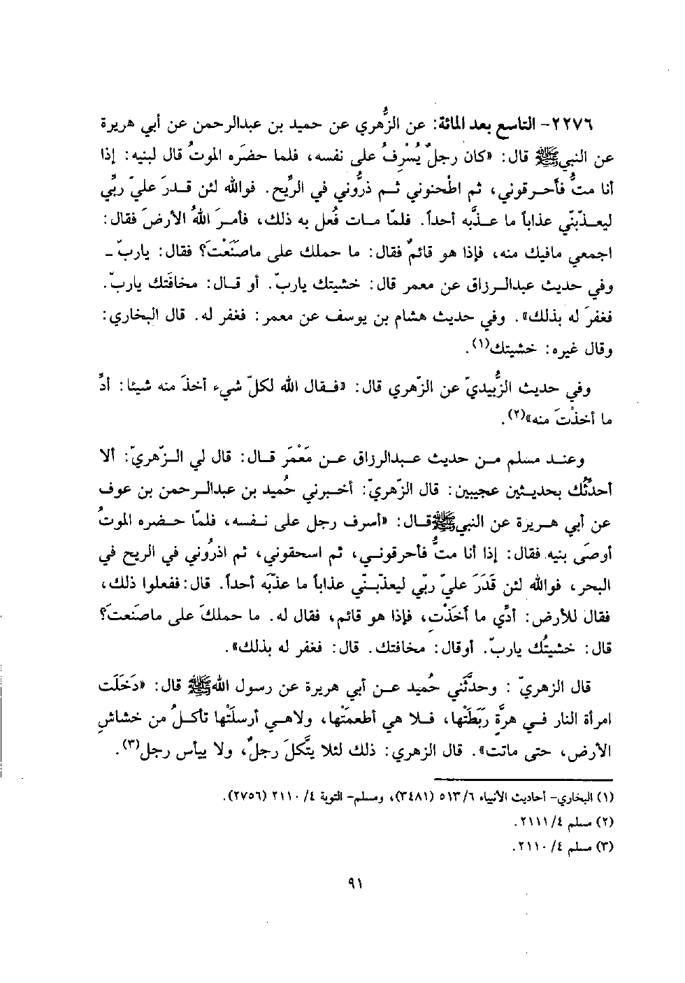 2276 - التَّاسِع بعد الْمِائَة: عَن الزُّهْرِيّ عَن حميد بن عبد الرَّحْمَن عَن أبي هُرَيْرَة عَن النَّبِي صلى الله عَلَيْهِ وَسلم قَالَ: " كَانَ رجلٌ يسرف على نَفسه، فَلَمَّا حَضَره الْمَوْت قَالَ لِبَنِيهِ: إِذا أَنا مت فأحرقوني، ثمَّ اطحنوني ثمَّ ذروني فِي الرّيح. فوَاللَّه لَئِن قدر عَليّ رَبِّي ليعذبني عذَابا مَا عذبه أحدا. فَلَمَّا مَاتَ فعل بِهِ ذَلِك، فَأمر الله الأَرْض فَقَالَ: اجمعي مَا فِيك مِنْهُ، فَإِذا هُوَ قائمٌ فَقَالَ: مَا حملك على مَا صنعت؟ فَقَالَ: يَا رب - وَفِي حَدِيث عبد الرَّزَّاق عَن معمر قَالَ: خشيتك يَا رب. أَو قَالَ: مخافتك يَا رب.
