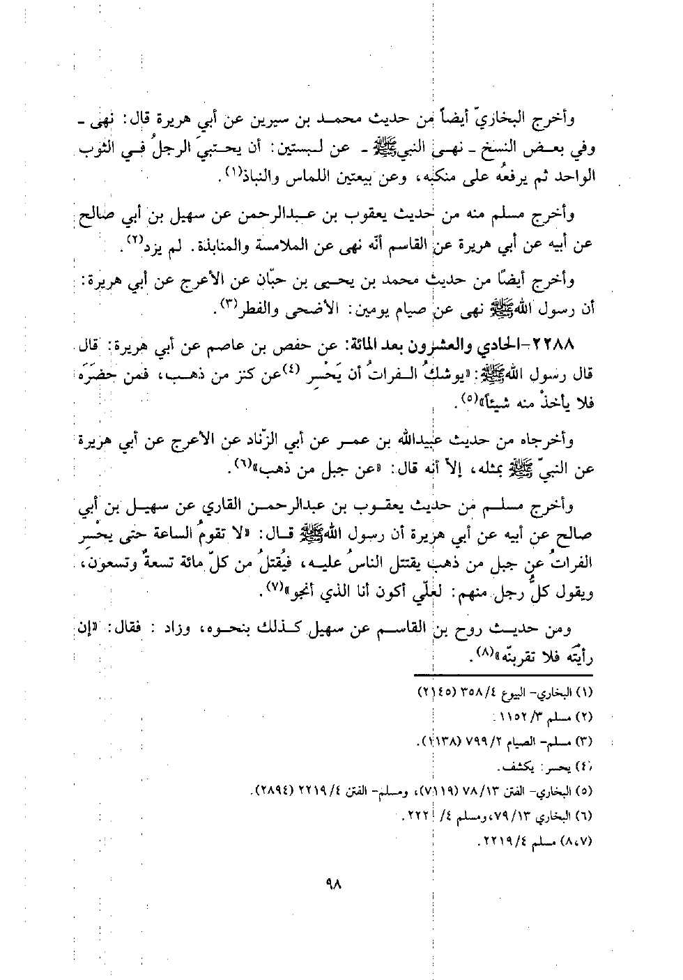 2288 - الْحَادِي وَالْعشْرُونَ بعد الْمِائَة: عَن حَفْص بن عَاصِم عَن أبي هُرَيْرَة: قَالَ قَالَ رَسُول الله صلى الله عَلَيْهِ وَسلم: " يُوشك الْفُرَات أَن يحسر عَن كنز من ذهب، فَمن حَضَره فَلَا يَأْخُذ مِنْهُ شَيْئا ".