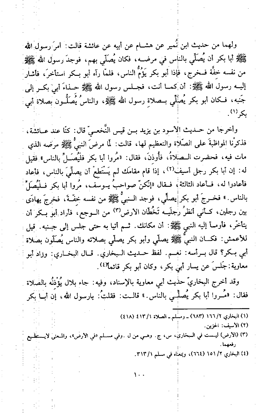 كُنَّا عِنْد عَائِشَة، فَذَكرنَا الْمُوَاظبَة على الصَّلَاة والتعظيم لَهَا، قَالَت: لما مرض النَّبِي صلى الله عَلَيْهِ وَسلم مَرضه الَّذِي مَاتَ فِيهِ، فَحَضَرت الصَّلَاة، فأوذن، فَقَالَ: " مروا أَبَا بكر فَليصل بِالنَّاسِ " فَقيل لَهُ: إِن أَبَا بكر رجل أسيف، إِذا قَامَ مقامك لم يسْتَطع أَن يُصَلِّي بِالنَّاسِ، فَأَعَادَ فَأَعَادُوا لَهُ، فَأَعَادَ الثَّالِثَة، فَقَالَ: " إنكن صَوَاحِب يُوسُف، مروا أَبَا بكر فَليصل بِالنَّاسِ. " فَخرج أَبُو بكر يُصَلِّي، فَوجدَ النَّبِي صلى الله عَلَيْهِ وَسلم من نَفسه خفَّة، فَخرج يهادى بَين رجلَيْنِ، كَأَنِّي أنظر رجلَيْهِ تخطان الأَرْض من الوجع، فَأَرَادَ أَبُو بكر أَن يتَأَخَّر، فَأَوْمأ إِلَيْهِ النَّبِي صلى الله عَلَيْهِ وَسلم: أَن مَكَانك. ثمَّ أَتَيَا بِهِ حَتَّى جلس إِلَى جنبه. قيل للأعمش: فَكَانَ النَّبِي صلى الله عَلَيْهِ وَسلم يُصَلِّي وَأَبُو بكر يُصَلِّي بِصَلَاتِهِ وَالنَّاس يصلونَ بِصَلَاة أبي بكر؟ قَالَ بِرَأْسِهِ: نعم. لفظ حَدِيث البُخَارِيّ. قَالَ البُخَارِيّ: وَزَاد أَبُو مُعَاوِيَة: جلس عَن يَاسر أبي بكر، وَكَانَ أَبُو بكر قَائِما.