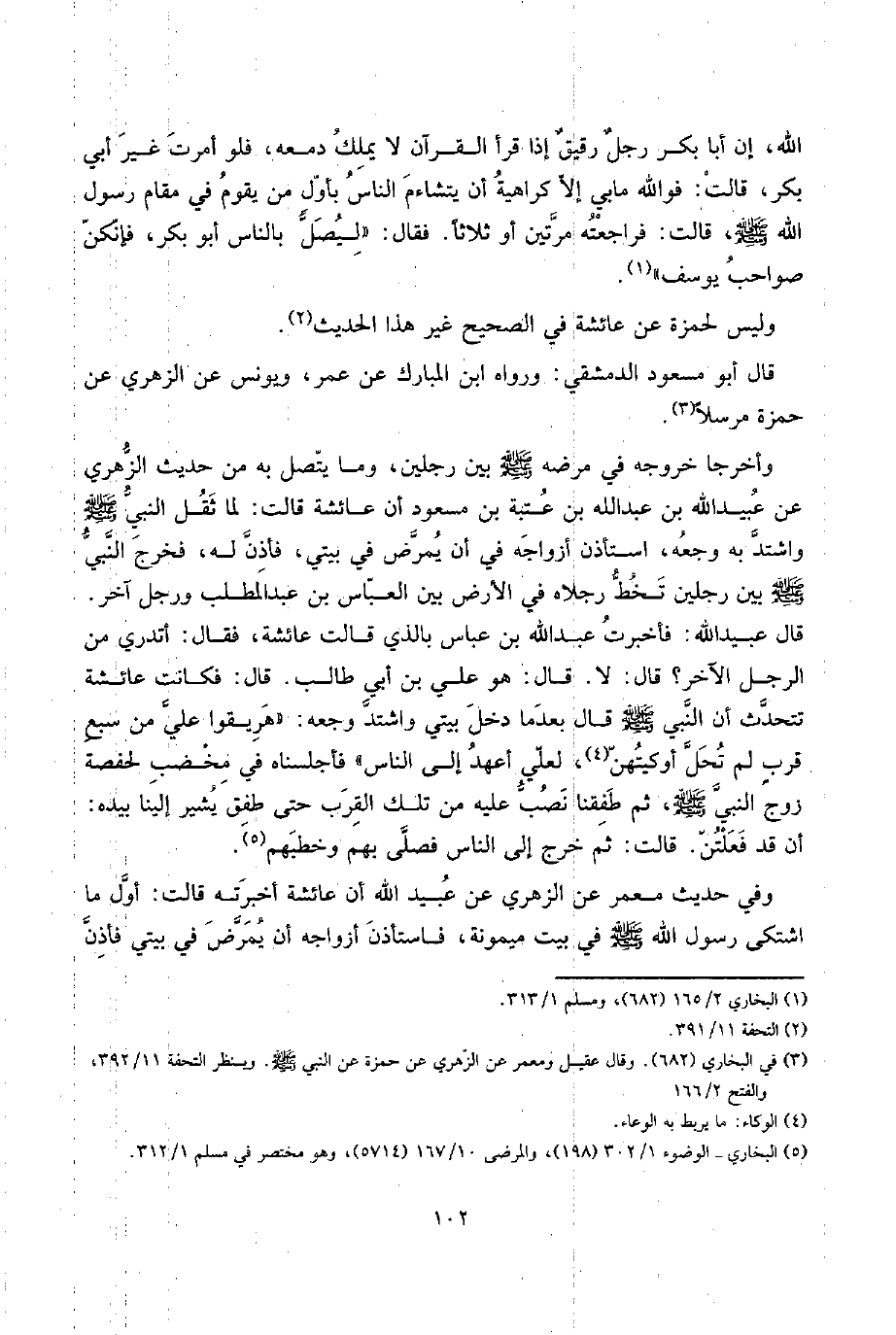 الله، إِن أَبَا بكر رجلٌ رَقِيق إِذا قَرَأَ الْقُرْآن لَا يملك دمعه، فَلَو أمرت غير أبي بكر، قَالَت: فوَاللَّه مَا بِي إِلَّا كَرَاهِيَة أَن يتشاءم النَّاس بِأول من يقوم فِي مقَام رَسُول الله صلى الله عَلَيْهِ وَسلم، قَالَت: فراجعته مرَّتَيْنِ أَو ثَلَاثًا. فَقَالَ: " ليصل بِالنَّاسِ أَبُو بكر، فَإِنَّكُنَّ صَوَاحِب يُوسُف ".