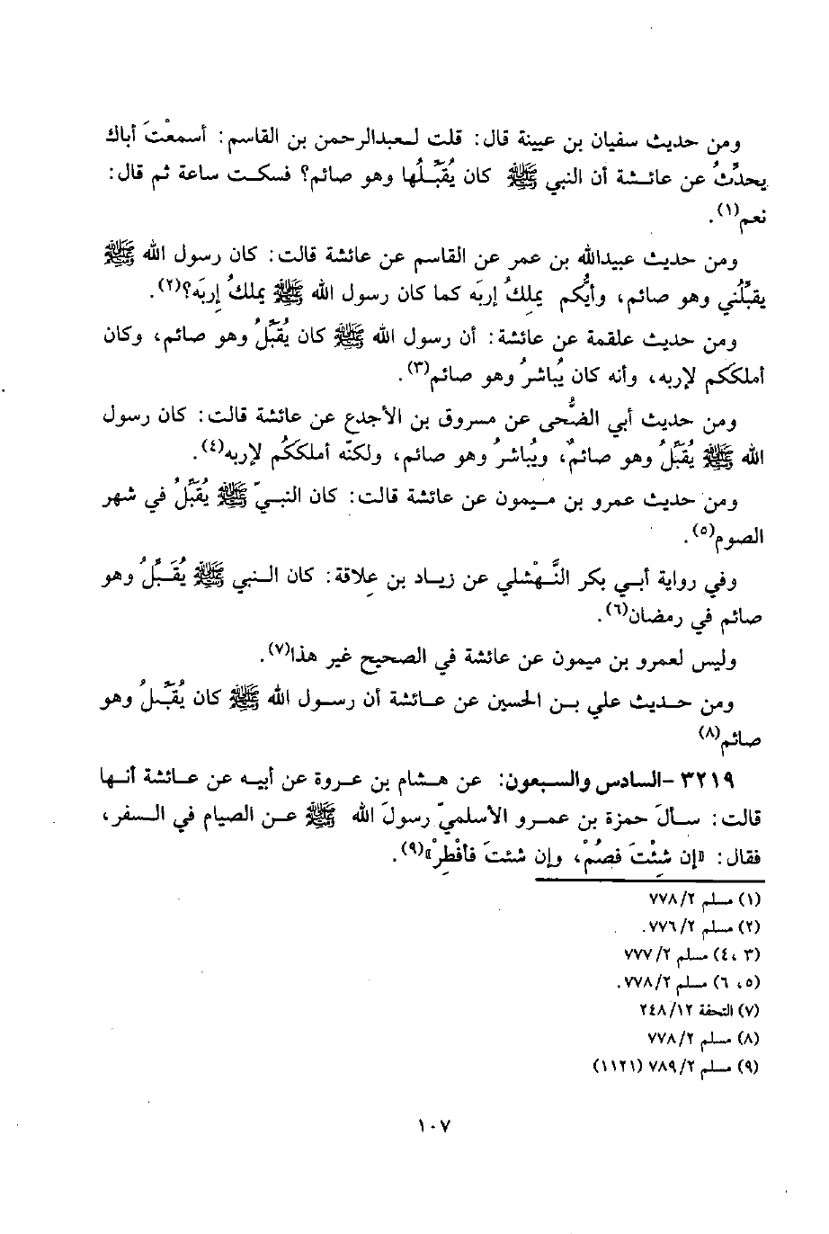 وَمن حَدِيث سُفْيَان بن عُيَيْنَة قَالَ: قلت لعبد الرَّحْمَن بن الْقَاسِم: أسمعت أَبَاك يحدث عَن عَائِشَة أَن النَّبِي صلى الله عَلَيْهِ وَسلم كَانَ يقبلهَا وَهُوَ صَائِم؟ فَسكت سَاعَة ثمَّ قَالَ: نعم.