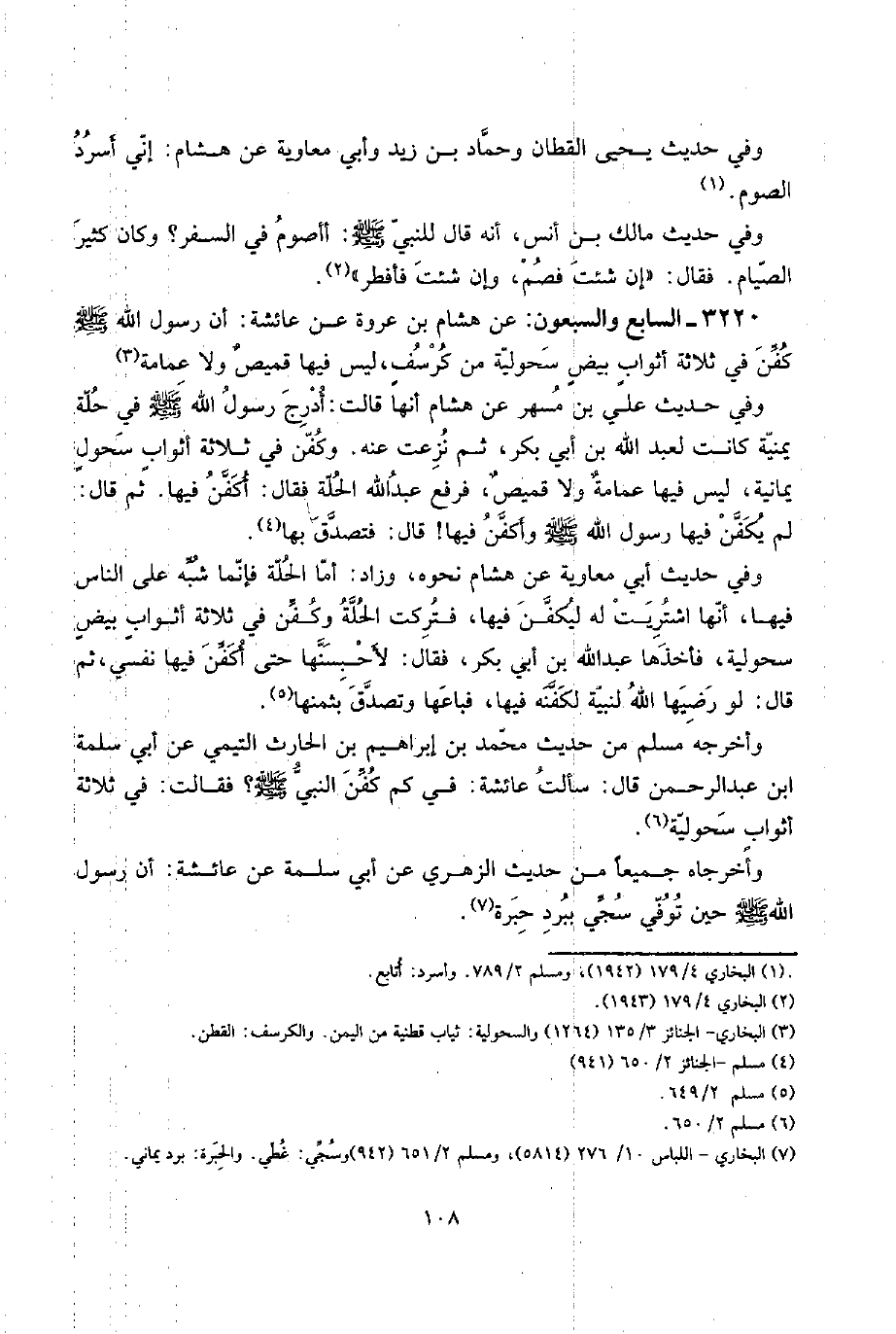 3220 - السَّابِع وَالسَّبْعُونَ: عَن هِشَام بن عُرْوَة عَن عَائِشَة: أَن رَسُول الله صلى الله عَلَيْهِ وَسلم كفن فِي ثَلَاثَة أثوابٍ بيضٍ سحُولِيَّة من كرسفٍ، لَيْسَ فِيهَا قميصٌ وَلَا عِمَامَة
