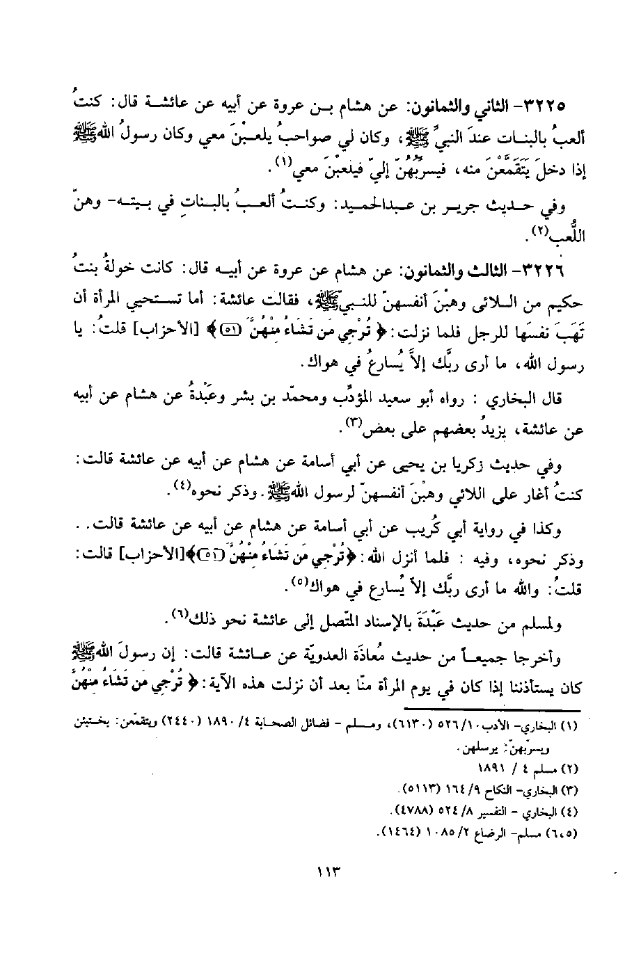 3225 - الثَّانِي وَالثَّمَانُونَ: عَن هِشَام بن عُرْوَة عَن أَبِيه عَن عَائِشَة قَالَ: كنت أَلعَب بالبنات عِنْد النَّبِي صلى الله عَلَيْهِ وَسلم، وَكَانَ لي صَوَاحِب يلعبن معي وَكَانَ رَسُول الله صلى الله عَلَيْهِ وَسلم إِذا دخل يتقمعن مِنْهُ، فيسربهن إِلَيّ فيلعبن معي.