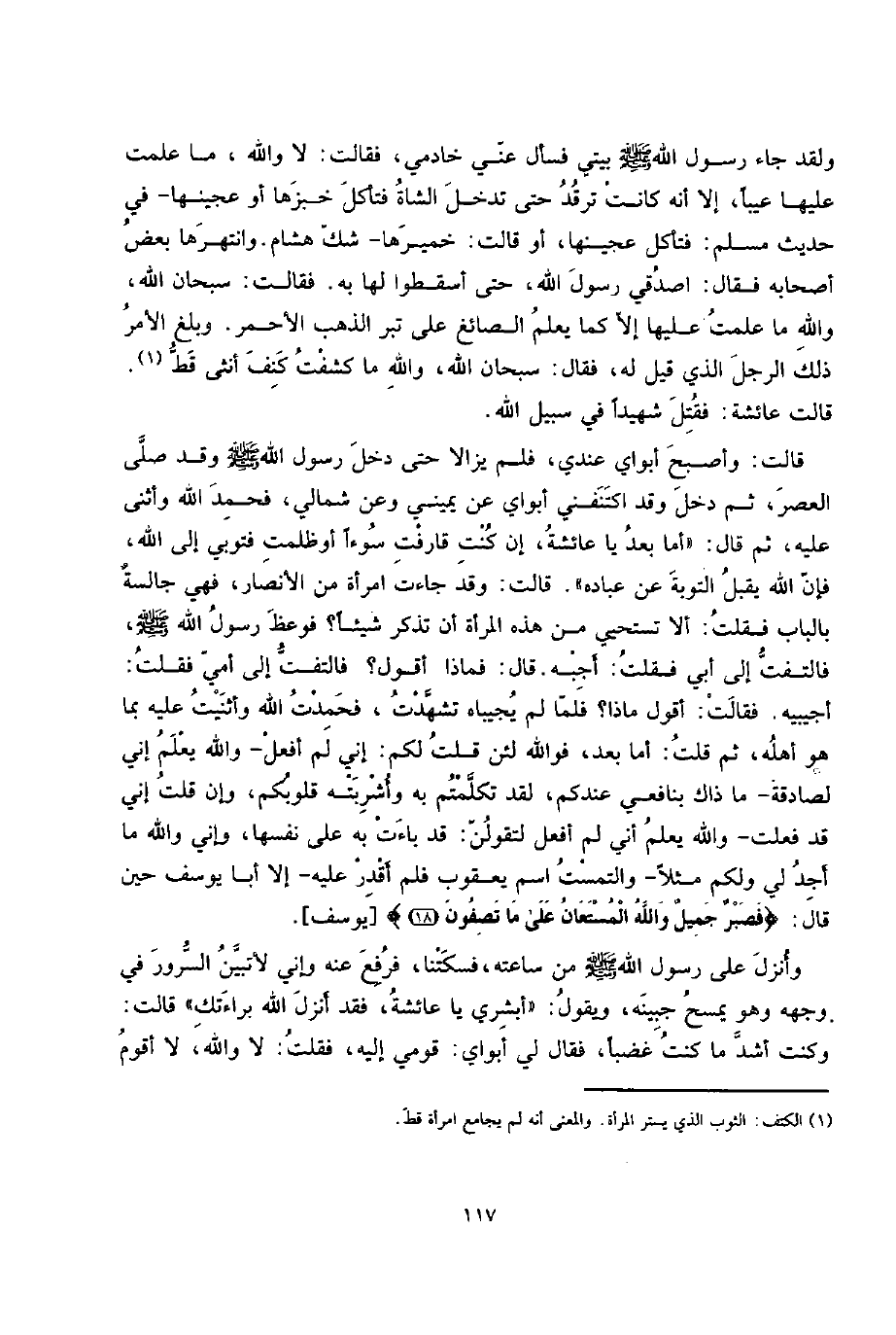 قَالَت: وَأصْبح أبواي عِنْدِي، فَلم يَزَالَا حَتَّى دخل رَسُول الله صلى الله عَلَيْهِ وَسلم وَقد صلى الْعَصْر، ثمَّ دخل وَقد اكتنفني أبواي عَن يَمِيني وَعَن شمَالي، فَحَمدَ الله وَأثْنى عَلَيْهِ، ثمَّ قَالَ: " أما بعد يَا عَائِشَة، إِن كنت قارفت سوءا أَو ظلمت فتوبي إِلَى الله، فَإِن الله يقبل التَّوْبَة عَن عباده ". قَالَت: وَقد جَاءَت امْرَأَة من الْأَنْصَار، فَهِيَ جالسةٌ بِالْبَابِ فَقلت: أَلا تَسْتَحي من هَذِه الْمَرْأَة أَن تذكر شَيْئا؟ فوعظ رَسُول الله صلى الله عَلَيْهِ وَسلم، فَالْتَفت إِلَى أبي فَقلت: أجبه. قَالَ: فَمَاذَا أَقُول؟ فَالْتَفت إِلَى أُمِّي فَقلت: أجيبيه. فَقَالَت: أَقُول مَاذَا؟ فَلَمَّا لم يجيباه تشهدت، فحمدت الله وأثنيت عَلَيْهِ بِمَا هُوَ أَهله، ثمَّ قلت: أما بعد، فوَاللَّه لَئِن قلت لكم: إِنِّي لم أفعل - وَالله يعلم إِنِّي لصادقة - مَا ذَاك بنافعي عنْدكُمْ، لقد تكلمتم بِهِ وأشربته قُلُوبكُمْ، وَإِن قلت إِنِّي قد فعلت - وَالله يعلم أَنِّي لم افْعَل لتقولن: قد باءت بِهِ على نَفسهَا، وَإِنِّي وَالله مَا أجد لي وَلكم مثلا - والتمست اسْم يَعْقُوب فَلم أقدر عَلَيْهِ - إِلَّا أَبَا يُوسُف حِين قَالَ: {فَصَبر جميل وَالله الْمُسْتَعَان على مَا تصفون} [يُوسُف] .