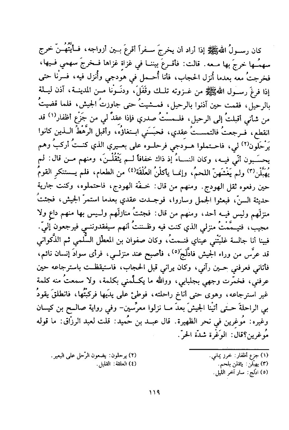 كَانَ رَسُول الله صلى الله عَلَيْهِ وَسلم إِذا أَرَادَ أَن يخرج سفرا أَقرع بَين أَزوَاجه، فأيتهن خرج سهمها خرج بهَا مَعَه. قَالَت: فأقرع بَيْننَا فِي غزاةٍ غَزَاهَا فَخرج سهمي فِيهَا، فَخرجت مَعَه بَعْدَمَا أنزل الْحجاب، فَأَنا أحمل فِي هودجي وَأنزل فِيهِ، فسرنا حَتَّى إِذا فرغ رَسُول الله صلى الله عَلَيْهِ وَسلم من غزوته تِلْكَ وقفل، ودنونا من الْمَدِينَة، آذن لَيْلَة بالرحيل، فَقُمْت حِين آذنوا بالرحيل، فمشيت حَتَّى جَاوَزت الْجَيْش، فَلَمَّا قضيت من شأني أَقبلت إِلَى الرحيل، فلمست صَدْرِي فَإِذا عقدٌ لي من جزع أظفار قد انْقَطع، فَرَجَعت فَالْتمست عقدي، فحبسني ابتغاؤه، وَأَقْبل الرَّهْط الَّذين كَانُوا يرحلون لي، فاحتملوا هودجي فرحلوه على بَعِيري الَّذِي كنت أركب وهم يحسبون أَنِّي فِيهِ، وَكَانَ النِّسَاء إِذْ ذَاك خفافاً لم يثقلن، وَمِنْهُم من قَالَ: لم يهبلن وَلم يغشهن اللَّحْم، وَإِنَّمَا يأكلن الْعلقَة من الطَّعَام، فَلم يستنكر الْقَوْم حِين رَفَعُوهُ ثقل الهودج. وَمِنْهُم من قَالَ: خفَّة الهودج، فاحتملوه، وَكنت جَارِيَة حَدِيثَة السن، فبعثوا الْجمل وَسَارُوا، فَوجدت عقدي بَعْدَمَا اسْتمرّ الْجَيْش، فَجئْت منزلهم وَلَيْسَ فِيهِ أحد، وَمِنْهُم من قَالَ: فَجئْت مَنَازِلهمْ وَلَيْسَ بهَا مِنْهُم داعٍ وَلَا مُجيب، فَتَيَمَّمت منزلي الَّذِي كنت فِيهِ وظننت أَنهم سيفقدونني فيرجعون إِلَيّ.