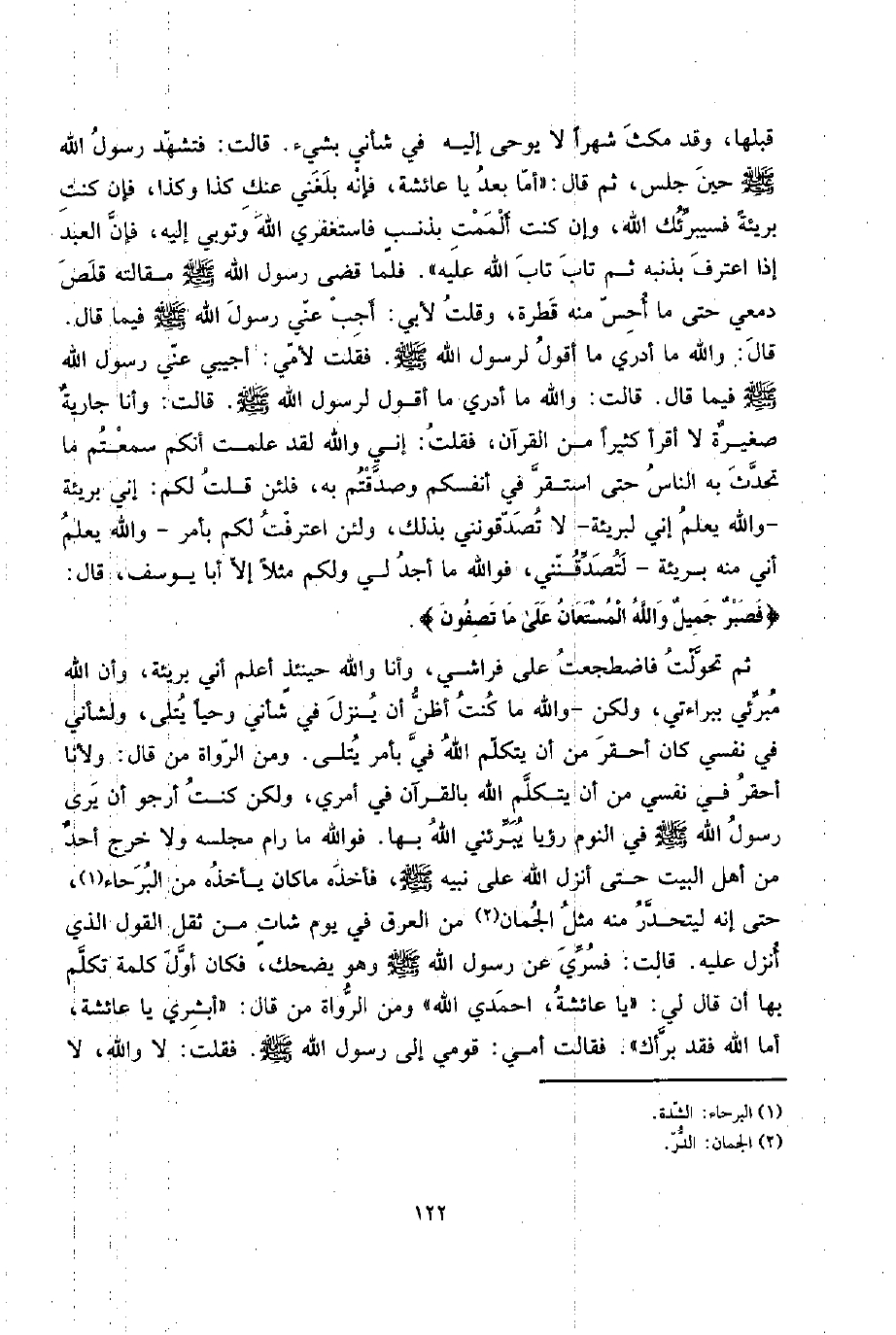 ثمَّ تحولت فاضطجعت على فِرَاشِي، وَأَنا وَالله حينئذٍ أعلم أَنِّي بريئة، وَأَن الله مبرئي ببراءتي، وَلَكِن - وَالله مَا كنت أَظن أَن ينزل فِي شأني وَحيا يُتْلَى، ولشأني فِي نَفسِي كَانَ أَحْقَر من أَن يتَكَلَّم الله فِي بِأَمْر يُتْلَى. وَمن الروَاة من قَالَ: ولأنا أَحْقَر فِي نَفسِي من أَن يتَكَلَّم الله بِالْقُرْآنِ فِي أَمْرِي، وَلَكِن كنت أَرْجُو أَن يرى رَسُول الله صلى الله عَلَيْهِ وَسلم فِي النّوم رُؤْيا يبرئني الله بهَا. فوَاللَّه مَا رام مَجْلِسه وَلَا خرج أحد من أهل الْبَيْت حَتَّى أنزل الله على نبيه صلى الله عَلَيْهِ وَسلم، فَأَخذه مَا كَانَ يَأْخُذهُ من البرحاء، حَتَّى إِنَّه ليتحدر مِنْهُ مثل الجمان من الْعرق فِي يَوْم شاتٍ من ثقل القَوْل الَّذِي أنزل عَلَيْهِ. قَالَت: فَسرِّي عَن رَسُول الله صلى الله عَلَيْهِ وَسلم وَهُوَ يضْحك، فَكَانَ أول كلمة تكلم بهَا أَن قَالَ لي: " يَا عَائِشَة، احمدي الله " وَمن الروَاة من قَالَ: " أَبْشِرِي يَا عَائِشَة، أما الله فقد براك ". فَقَالَت أُمِّي: قومِي إِلَى رَسُول الله صلى الله عَلَيْهِ وَسلم. فَقلت: لَا وَالله، لَا