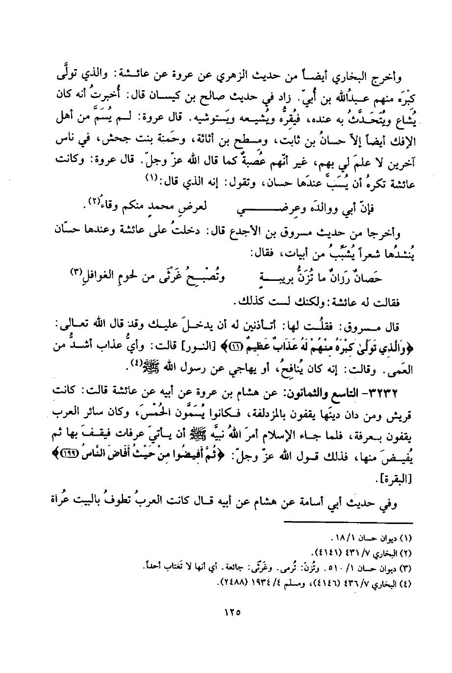 وَالَّذِي تولى كبره مِنْهُم عبد الله بن أبي. زَاد فِي حَدِيث صَالح بن كيسَان قَالَ: أخْبرت أَنه كَانَ يشاع ويتحدث بِهِ عِنْده، فيقره ويشيعه ويستوشيه. قَالَ عُرْوَة: لم يسم من أهل الْإِفْك أَيْضا إِلَّا حسان بن ثَابت، ومسطح بن أَثَاثَة، وَحمْنَة بنت جحش، فِي نَاس آخَرين لَا علم لي بهم، غير أَنهم عصبةٌ كَمَا قَالَ الله عز وَجل. قَالَ عُرْوَة: وَكَانَت عَائِشَة تكره أَن يسب عِنْدهَا حسان، وَتقول: إِنَّه الَّذِي قَالَ:
