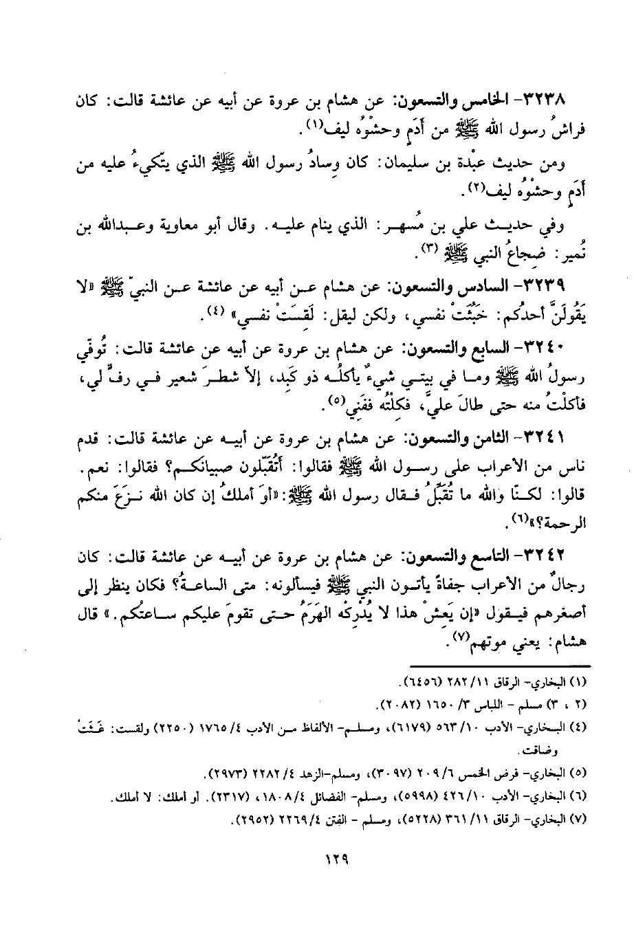 3238 - الْخَامِس وَالتِّسْعُونَ: عَن هِشَام بن عُرْوَة عَن أَبِيه عَن عَائِشَة قَالَت: كَانَ فرَاش رَسُول الله صلى الله عَلَيْهِ وَسلم من أدمٍ وحشوه لِيف.