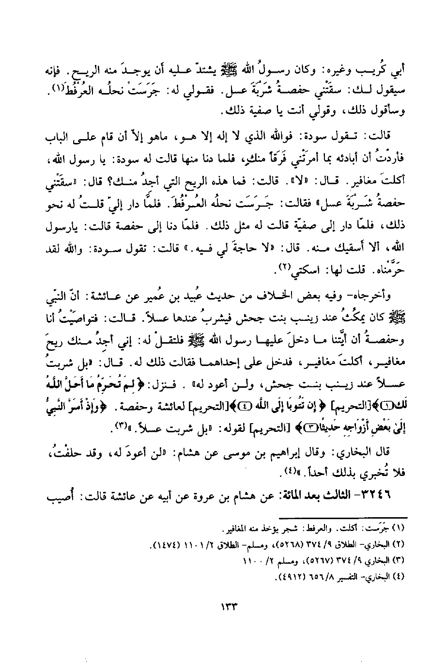 أَن النَّبِي صلى الله عَلَيْهِ وَسلم كَانَ يمْكث عِنْد زَيْنَب بنت جحش فيشرب عِنْدهَا عسلاً. قَالَت: فتواصيت أَنا وَحَفْصَة أَن أَيَّتنَا مَا دخل عَلَيْهَا رَسُول الله صلى الله عَلَيْهِ وَسلم فَلْتَقُلْ لَهُ: إِنِّي أجد مِنْك ريح مَغَافِير، أكلت مَغَافِير، فَدخل على إِحْدَاهمَا فَقَالَت ذَلِك لَهُ. قَالَ: " بل شربت عسلاً عِنْد زَيْنَب بنت جحش، وَلنْ أَعُود لَهُ ". فَنزل: {لم تحرم مَا أحل الله لَك} [التَّحْرِيم] {إِن تَتُوبَا إِلَى الله} [التَّحْرِيم] لعَائِشَة وَحَفْصَة. {وَإِذا أسر النَّبِي إِلَى بعض أَزوَاجه حَدِيثا} [التَّحْرِيم] لقَوْله: " بل شربت عسلاً. ".