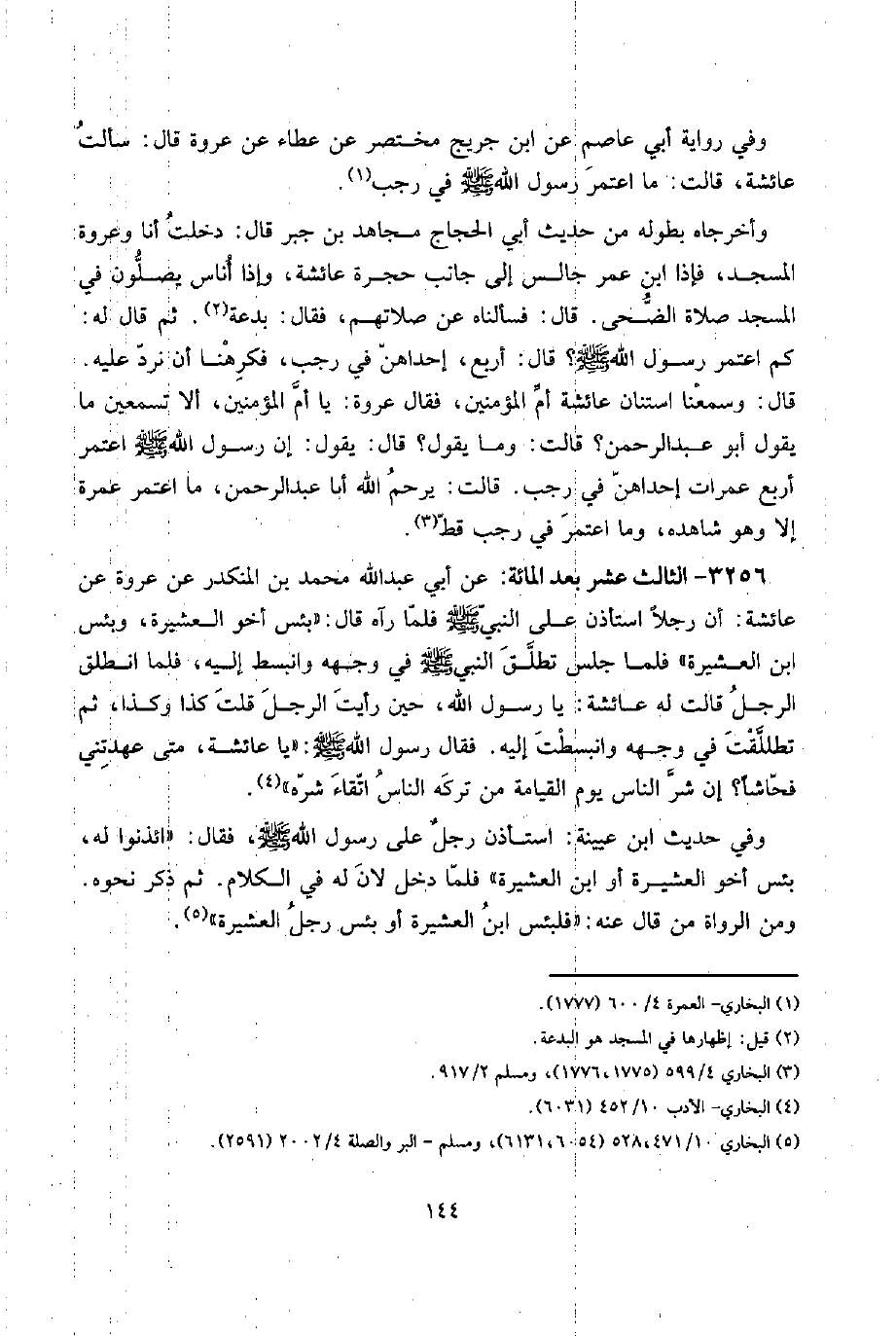 دخلت أَنا وَعُرْوَة الْمَسْجِد، فَإِذا ابْن عمر جَالس إِلَى جَانب حجرَة عَائِشَة، وَإِذا أنَاس يصلونَ فِي الْمَسْجِد صَلَاة الضُّحَى. قَالَ: فَسَأَلْنَاهُ عَن صلَاتهم، فَقَالَ: بِدعَة. ثمَّ قَالَ لَهُ: كم اعْتَمر رَسُول الله صلى الله عَلَيْهِ وَسلم؟ قَالَ: أَربع، إِحْدَاهُنَّ فِي رَجَب، فكرهنا أَن نرد عَلَيْهِ.