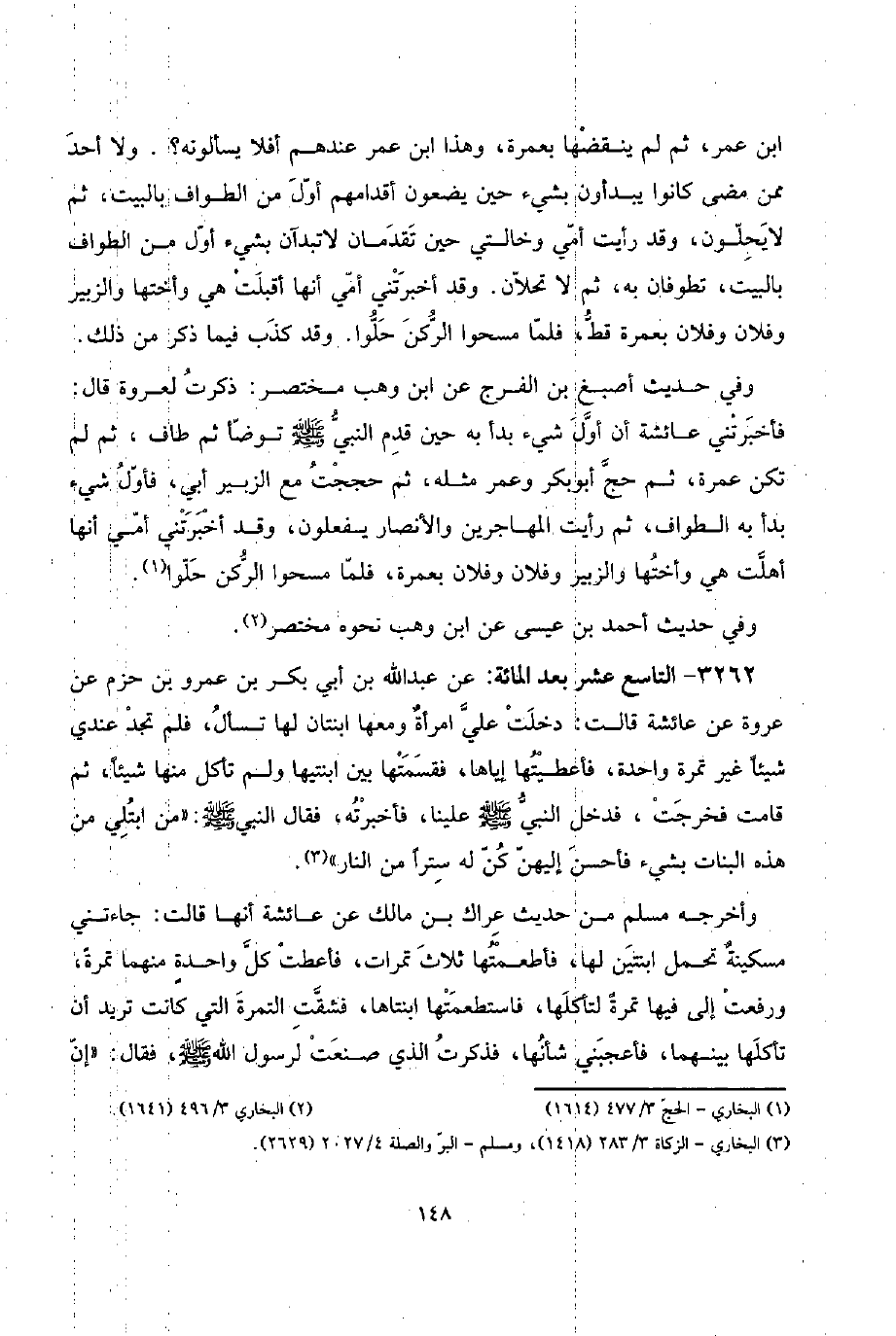 3262 - التَّاسِع عشر بعد الْمِائَة: عَن عبد الله بن أبي بكر بن عَمْرو بن حزم عَن عُرْوَة عَن عَائِشَة قَالَت: دخلت عَليّ امرأةٌ وَمَعَهَا ابنتان لَهَا تسْأَل، فَلم تَجِد عِنْدِي شَيْئا غير تَمْرَة وَاحِدَة، فأعطيتها إِيَّاهَا، فقسمتها بَين ابنتيها وَلم تَأْكُل مِنْهَا شَيْئا، ثمَّ قَامَت فَخرجت، فَدخل النَّبِي صلى الله عَلَيْهِ وَسلم علينا، فَأَخْبَرته، فَقَالَ النَّبِي صلى الله عَلَيْهِ وَسلم: " من ابْتُلِيَ من هَذِه الْبَنَات بِشَيْء فَأحْسن إلَيْهِنَّ كن لَهُ سترا من النَّار ".