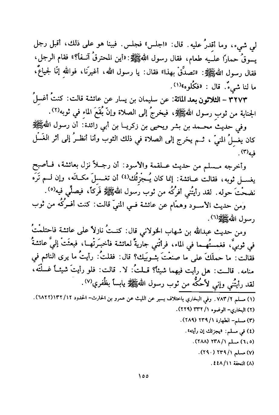 3273 - الثَّلَاثُونَ بعد الْمِائَة: عَن سُلَيْمَان بن يسَار عَن عَائِشَة قَالَت: كنت أغسل الْجَنَابَة من ثوب رَسُول الله صلى الله عَلَيْهِ وَسلم، فَيخرج إِلَى الصَّلَاة، وَإِن بقع المَاء فِي ثَوْبه.