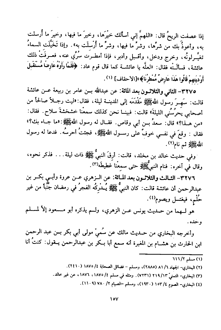 3275 - الثَّانِي وَالثَّلَاثُونَ بعد الْمِائَة: عَن عبد الله بن عَامر بن ربيعَة عَن عَائِشَة قَالَت: سهر رَسُول الله صلى الله عَلَيْهِ وَسلم مقدمه إِلَى الْمَدِينَة لَيْلَة، فَقَالَ: " لَيْت رجلا صَالحا من أَصْحَابِي يَحْرُسنِي اللَّيْلَة " قَالَت: فَبينا نَحن كَذَلِك سمعنَا خشخشة سلَاح. فَقَالَ: " من هَذَا؟ " قَالَ: سعد بن أبي وَقاص. فَقَالَ لَهُ رَسُول الله صلى الله عَلَيْهِ وَسلم: " مَا جَاءَ بك؟ " فَقَالَ: وَقع فِي نَفسِي خوفٌ على رَسُول الله صلى الله عَلَيْهِ وَسلم، فَجئْت أحرسه. فَدَعَا لَهُ رَسُول الله صلى الله عَلَيْهِ وَسلم ثمَّ نَام.