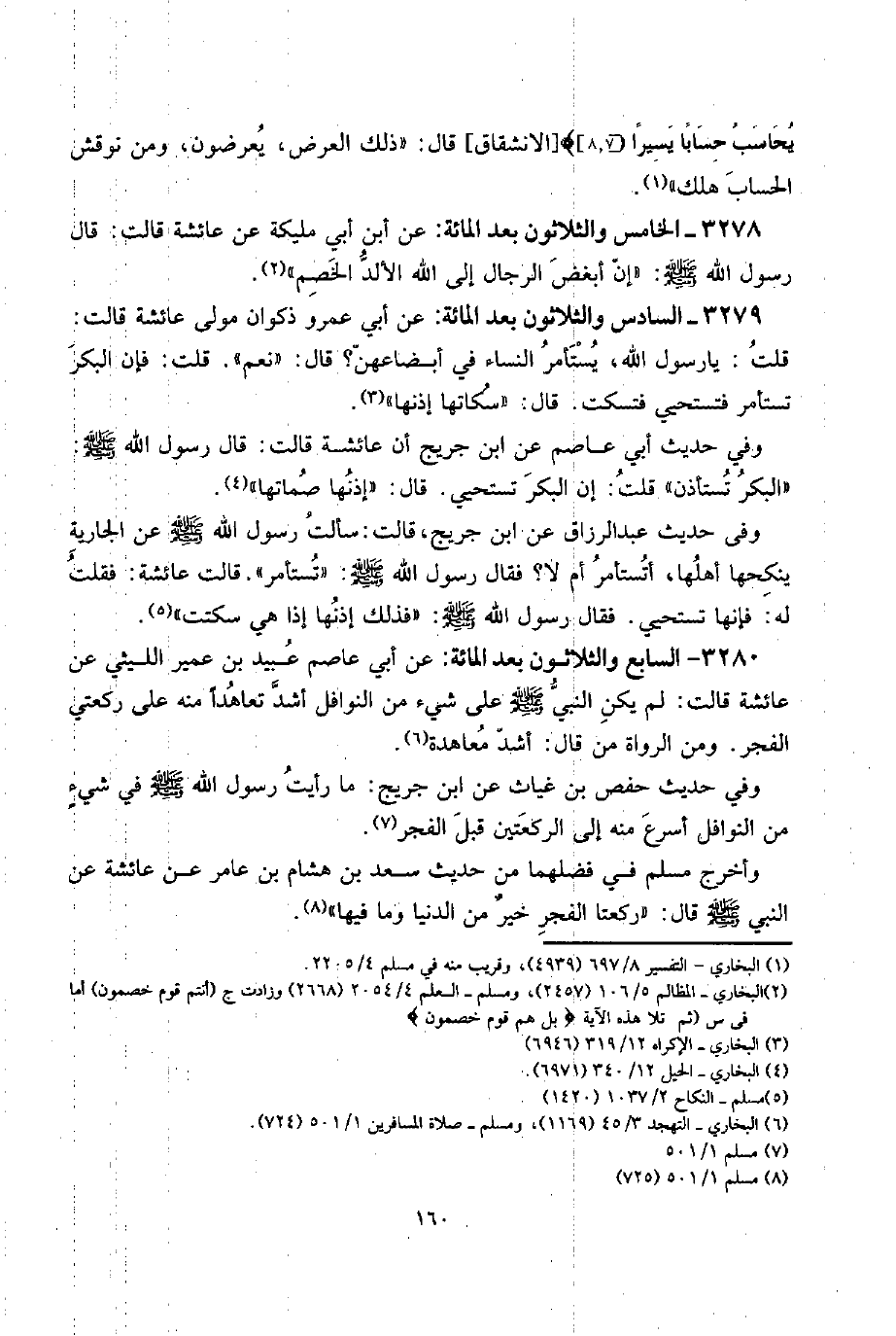 3280 - السَّابِع وَالثَّلَاثُونَ بعد الْمِائَة: عَن أبي عَاصِم عبيد بن عُمَيْر اللَّيْثِيّ عَن عَائِشَة قَالَت: لم يكن النَّبِي صلى الله عَلَيْهِ وَسلم على شَيْء من النَّوَافِل أَشد تعاهداً مِنْهُ على رَكْعَتي الْفجْر. وَمن الروَاة من قَالَ: أَشد معاهدة.