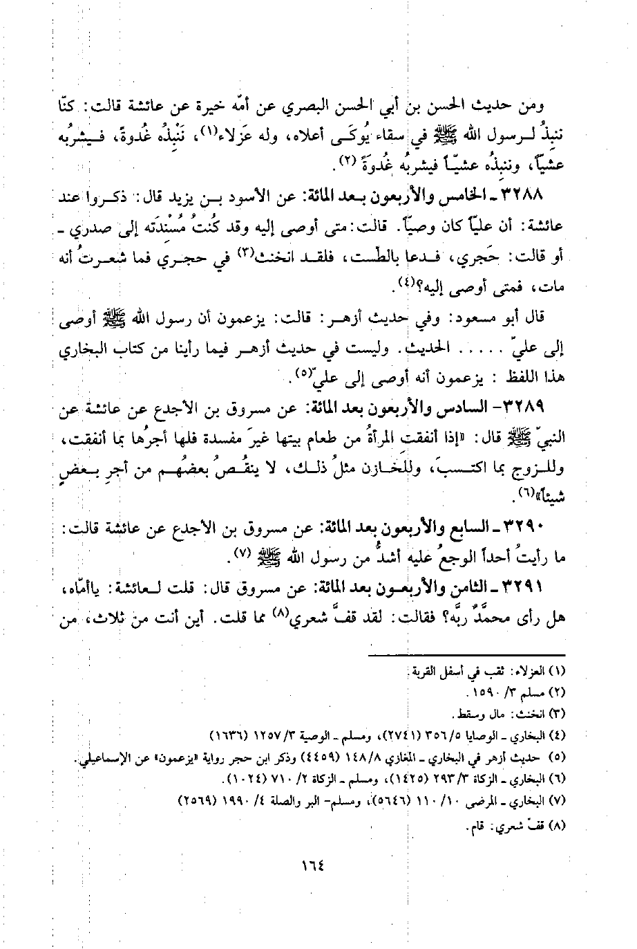3288 - الْخَامِس وَالْأَرْبَعُونَ بعد الْمِائَة: عَن الْأسود بن يزِيد قَالَ: ذكرُوا عِنْد عَائِشَة: أَن عليا كَانَ وَصِيّا. قَالَت: مَتى أوصى إِلَيْهِ وَقد كنت مسندته إِلَى صَدْرِي - أَو قَالَت: حجري، فَدَعَا بالطست، فَلَقَد انخنث فِي حجري فَمَا شَعرت انه مَاتَ، فَمَتَى أوصى إِلَيْهِ؟ .