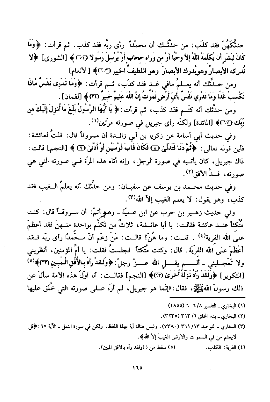 أَن مسروقاً قَالَ: كنت مُتكئا عِنْد عَائِشَة فَقَالَت: يَا أَبَا عَائِشَة، ثلاثٌ من تكلم بواحدةٍ مِنْهُنَّ فقد أعظم على الله الْفِرْيَة. قلت: وَمَا هن؟ قَالَت: من زعم أَن مُحَمَّدًا رأى بِهِ ربه فقد أعظم على الله الْفِرْيَة. قَالَ: وَكنت مُتكئا فَجَلَست فَقلت: يَا أم الْمُؤمنِينَ، انظريني وَلَا تعجليني - ألم يقل الله عز وَجل: {وَلَقَد رَآهُ بالأفق الْمُبين} [التكوير] {وَلَقَد رَآهُ نزلة أُخْرَى} [النَّجْم] فَقَالَت: أَنا أول هَذِه الْأمة سَأَلَ عَن ذَلِك رَسُول الله صلى الله عَلَيْهِ وَسلم، فَقَالَ: " إِنَّمَا هُوَ جِبْرِيل، لم أره على صورته الَّتِي خلق عَلَيْهَا