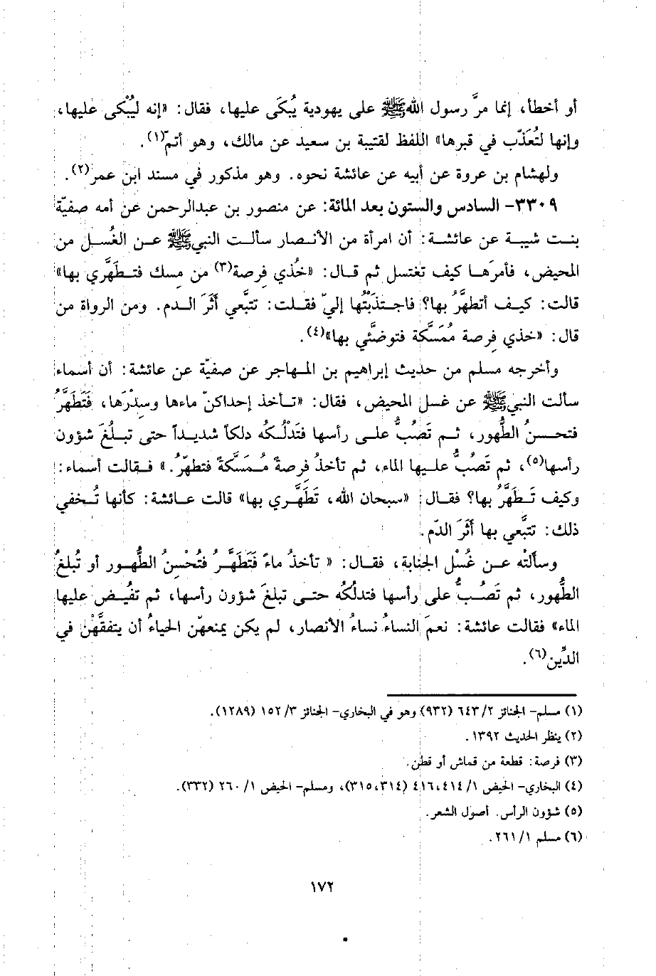 3309 - السَّادِس وَالسِّتُّونَ بعد الْمِائَة: عَن مَنْصُور بن عبد الرَّحْمَن عَن أمه صَفِيَّة بنت شيبَة عَن عَائِشَة: أَن امْرَأَة من الْأَنْصَار سَأَلت النَّبِي صلى الله عَلَيْهِ وَسلم عَن الْغسْل من الْمَحِيض، فَأمرهَا كَيفَ تَغْتَسِل ثمَّ قَالَ: " خذي فرْصَة من مسك فتطهري بهَا " قَالَت: كَيفَ أتطهر بهَا؟ فاجتذبتها إِلَيّ فَقلت: تتبعي أثر الدَّم. وَمن الروَاة من قَالَ: " خذي فرْصَة ممسكة فتوضئي بهَا ".