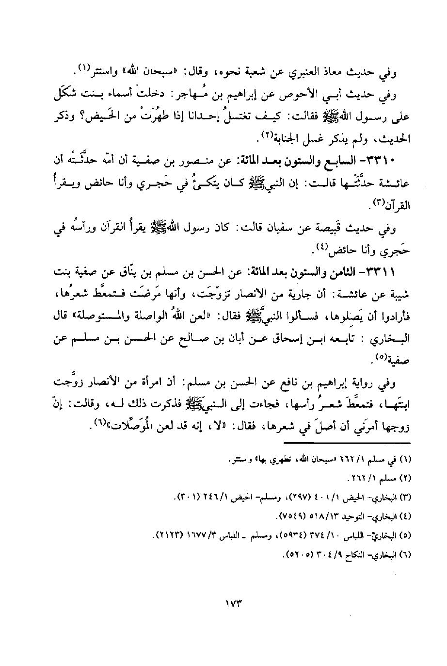 3311 - الثَّامِن وَالسِّتُّونَ بعد الْمِائَة: عَن الْحسن بن مُسلم بن يناق عَن صَفِيَّة بنت شيبَة عَن عَائِشَة: أَن جَارِيَة من الْأَنْصَار تزوجت، وَأَنَّهَا مَرضت فتمعط شعرهَا، فأرادوا أَن يصلوها، فسألوا النَّبِي صلى الله عَلَيْهِ وَسلم فَقَالَ: " لعن الله الْوَاصِلَة وَالْمسْتَوْصِلَة " قَالَ البُخَارِيّ: تَابعه ابْن إِسْحَاق عَن أبان بن صَالح عَن الْحسن بن مُسلم عَن صَفِيَّة.