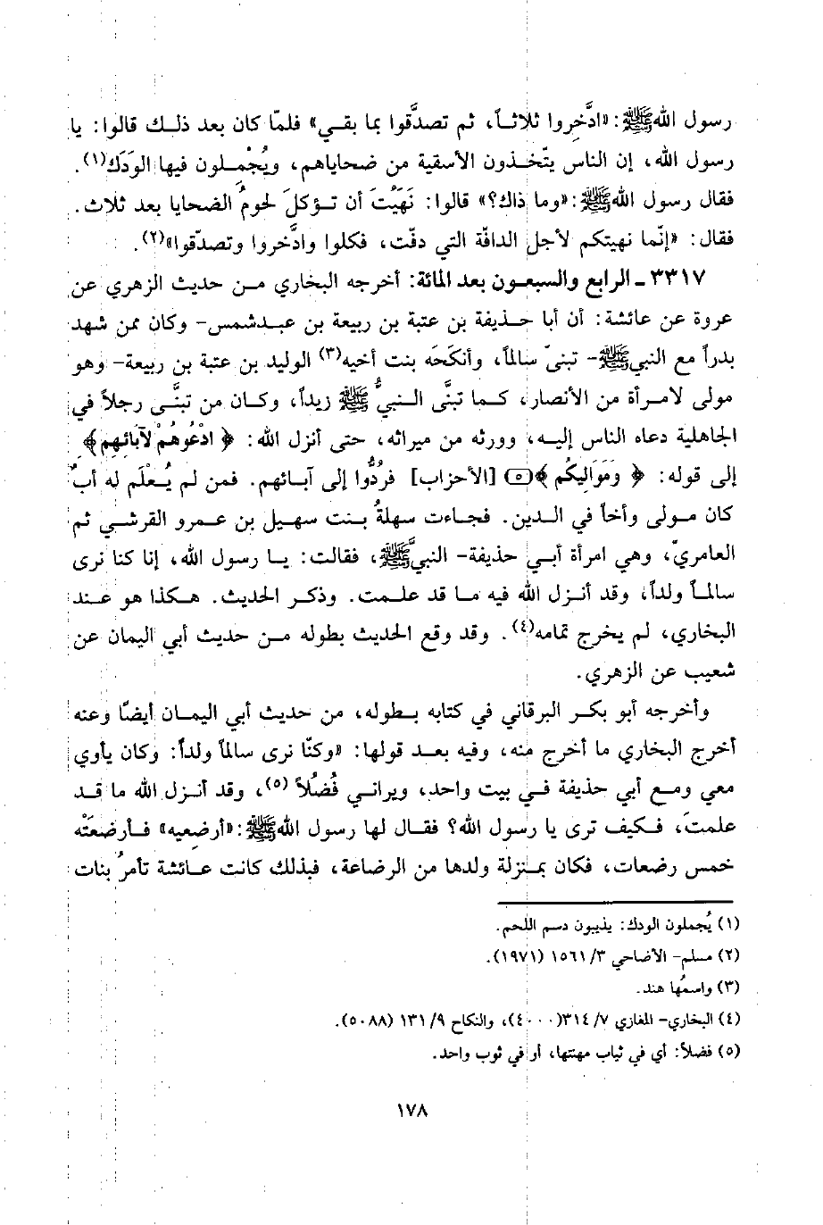 3317 - الرَّابِع وَالسَّبْعُونَ بعد الْمِائَة: أخرجه البُخَارِيّ من حَدِيث الزُّهْرِيّ عَن عُرْوَة عَن عَائِشَة: أَن أَبَا حُذَيْفَة بن عتبَة بن ربيعَة بن عبد شمس - وَكَانَ مِمَّن شهد بَدْرًا مَعَ النَّبِي صلى الله عَلَيْهِ وَسلم - تبنى سالما، وأنكحه بنت أَخِيه الْوَلِيد بن عتبَة بن ربيعَة - وَهُوَ مولى لامْرَأَة من الْأَنْصَار، كَمَا تبنى النَّبِي صلى الله عَلَيْهِ وَسلم زيدا، وَكَانَ من تبنى رجلا فِي الْجَاهِلِيَّة دَعَاهُ النَّاس إِلَيْهِ، وَورثه من مِيرَاثه، حَتَّى أنزل الله: {ادعوهُمْ لِآبَائِهِمْ} إِلَى قَوْله: {ومواليكم} [الْأَحْزَاب] فَردُّوا إِلَى آبَائِهِم. فَمن لم يعلم لَهُ أبٌ كَانَ مولى وأخاً فِي الدّين. فَجَاءَت سهلة بنت سُهَيْل بن عَمْرو الْقرشِي ثمَّ العامري، وَهِي امْرَأَة أبي حُذَيْفَة - النَّبِي صلى الله عَلَيْهِ وَسلم، فَقَالَت: يَا رَسُول الله، إِنَّا كُنَّا نرى سالما ولدا، وَقد أنزل الله فِيهِ مَا قد علمت. وَذكر الحَدِيث. هَكَذَا هُوَ عِنْد البُخَارِيّ، لم يخرج تَمَامه. وَقد وَقع الحَدِيث بِطُولِهِ من حَدِيث أبي الْيَمَان عَن شُعَيْب عَن الزُّهْرِيّ.