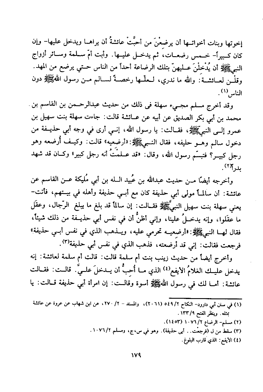 إخوتها وَبَنَات أخواتها أَن يرضعن من أحبت عَائِشَة أَن يَرَاهَا وَيدخل عَلَيْهَا - وَإِن كَانَ كَبِيرا - خمس رَضعَات، ثمَّ يدْخل عَلَيْهَا. وأبت أم سَلمَة وَسَائِر أَزوَاج النَّبِي صلى الله عَلَيْهِ وَسلم أَن يدخلن عَلَيْهِنَّ بِتِلْكَ الرضَاعَة أحدا من النَّاس حتي يرضع من المهد.