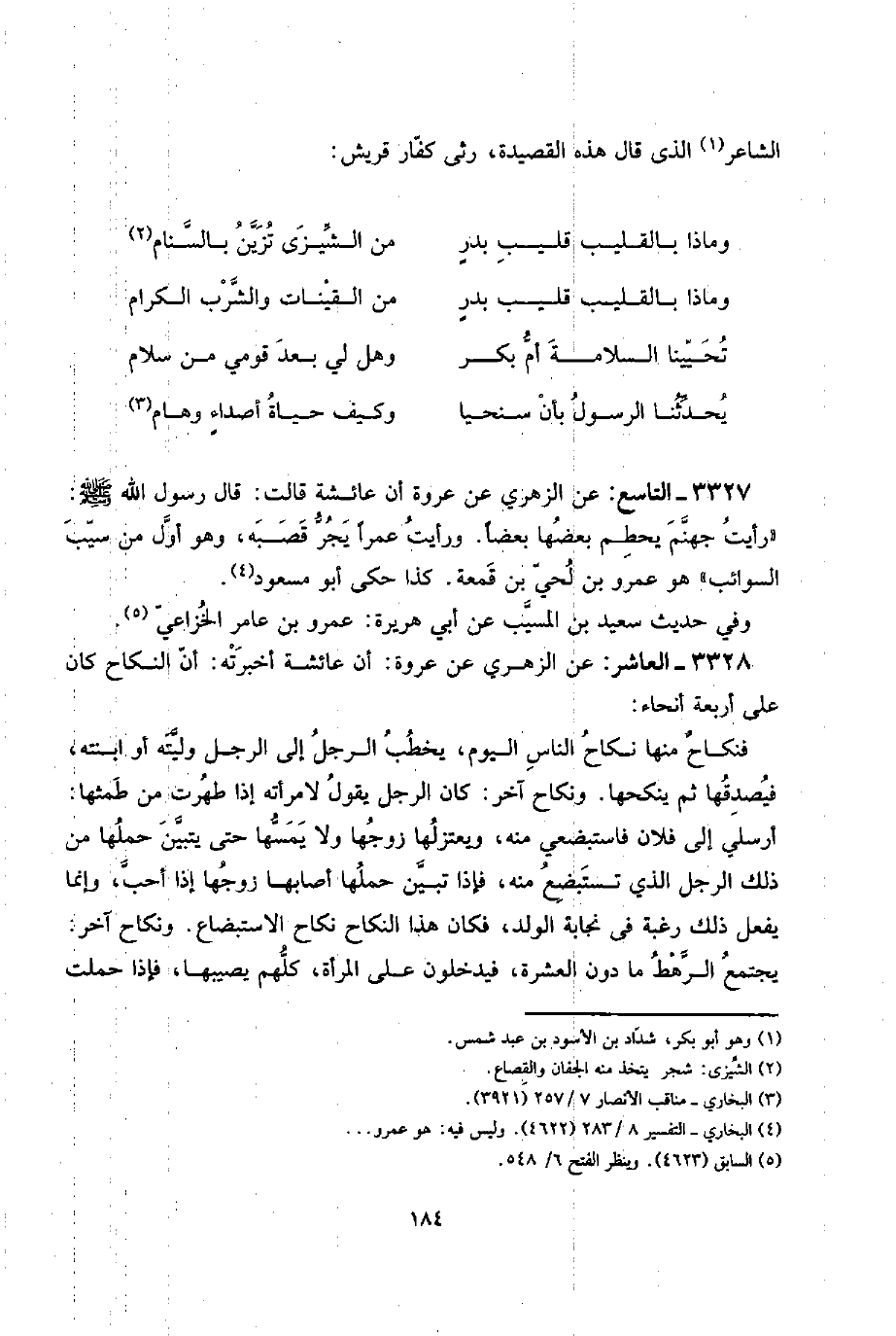 وَفِي حَدِيث سعيد بن الْمسيب عَن أبي هُرَيْرَة: عَمْرو بن عَامر الْخُزَاعِيّ. 3328 - الْعَاشِر: عَن الزُّهْرِيّ عَن عُرْوَة: أَن عَائِشَة أخْبرته: أَن النِّكَاح كَانَ على أَرْبَعَة أنحاء: فنكاحٌ مِنْهَا نِكَاح النَّاس الْيَوْم، يخْطب الرجل إِلَى الرجل وليته أَو ابْنَته، فيصدقها ثمَّ ينْكِحهَا. وَنِكَاح آخر: كَانَ الرجل يَقُول لامْرَأَته إِذا طهرت من طمثها: أرسلي إِلَى فلَان فاستبضعي مِنْهُ، ويعتزلها زَوجهَا وَلَا يَمَسهَا حَتَّى يتَبَيَّن حملهَا من ذَلِك الرجل الَّذِي تستبضع مِنْهُ، فَإِذا تبين حملهَا أَصَابَهَا زَوجهَا إِذا أحب، وَإِنَّمَا يفعل ذَلِك رَغْبَة فِي نجابة الْوَلَد، فَكَانَ هَذَا النِّكَاح نِكَاح الاستبضاع. وَنِكَاح آخر: يجْتَمع الرَّهْط مَا دون الْعشْرَة، فَيدْخلُونَ على الْمَرْأَة، كلهم يُصِيبهَا، فَإِذا حملت