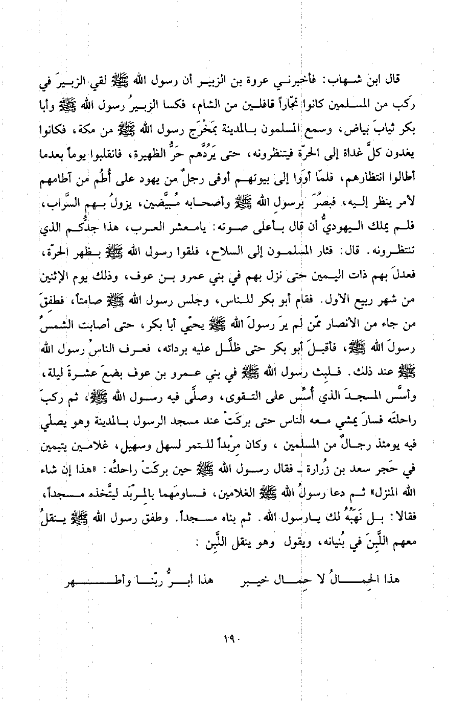 فَأَخْبرنِي عُرْوَة بن الزبير أَن رَسُول الله صلى الله عَلَيْهِ وَسلم لَقِي الزبير فِي ركب من الْمُسلمين كَانُوا تجارًا قافلين من الشَّام، فكسا الزبير رَسُول الله صلى الله عَلَيْهِ وَسلم وَأَبا بكر ثِيَاب بَيَاض، وَسمع الْمُسلمُونَ بِالْمَدِينَةِ بمخرج رَسُول الله صلى الله عَلَيْهِ وَسلم من مَكَّة، فَكَانُوا يَغْدُونَ كل غَدَاة إِلَى الْحرَّة فيتنظرونه، حَتَّى يردهم حر الظهيرة، فانقلبوا يَوْمًا بَعْدَمَا أطالوا انتظارهم، فَلَمَّا أووا إِلَى بُيُوتهم أوفى رجلٌ من يهود على أَطَم من آطامهم لأمر ينظر إِلَيْهِ، فَبَصر برَسُول الله صلى الله عَلَيْهِ وَسلم وَأَصْحَابه مبيضين، يَزُول بهم السراب، فَلم يملك الْيَهُودِيّ أَن قَالَ بِأَعْلَى صَوته: يَا معشر الْعَرَب، هَذَا جدكم الَّذِي تنتظرونه. قَالَ: فثار الْمُسلمُونَ إِلَى السِّلَاح، فَلَقوا رَسُول الله صلى الله عَلَيْهِ وَسلم بِظهْر الْحرَّة، فَعدل بهم ذَات الْيَمين حَتَّى نزل بهم فِي بني عَمْرو بن عَوْف، وَذَلِكَ يَوْم الْإِثْنَيْنِ من شهر ربيع الأول. فَقَامَ أَبُو بكر للنَّاس، وَجلسَ رَسُول الله صلى الله عَلَيْهِ وَسلم صامتاً، فَطَفِقَ من جَاءَ من الْأَنْصَار مِمَّن لم ير رَسُول الله صلى الله عَلَيْهِ وَسلم يحيي أَبَا بكر، حَتَّى أَصَابَت الشَّمْس رَسُول الله صلى الله عَلَيْهِ وَسلم، فَأقبل أَبُو بكر حَتَّى ظلل عَلَيْهِ بردائه، فَعرف النَّاس رَسُول الله صلى الله عَلَيْهِ وَسلم عِنْد ذَلِك. فَلبث رَسُول الله صلى الله عَلَيْهِ وَسلم فِي بني عَمْرو بن عَوْف بضع عشرَة لَيْلَة، وَأسسَ الْمَسْجِد الَّذِي أسس على التَّقْوَى، وَصلى فِيهِ رَسُول الله صلى الله عَلَيْهِ وَسلم، ثمَّ ركب رَاحِلَته فَسَار يمشي مَعَه النَّاس حَتَّى بَركت عِنْد مَسْجِد الرَّسُول بِالْمَدِينَةِ وَهُوَ يُصَلِّي فِيهِ يومئذٍ رجالٌ من الْمُسلمين، وَكَانَ مربداً للتمر لسهل وَسُهيْل، غلامين يتيمين فِي حجر سعد بن زُرَارَة - فَقَالَ رَسُول الله صلى الله عَلَيْهِ وَسلم حِين بَركت رَاحِلَته: " هَذَا إِن شَاءَ الله الْمنزل " ثمَّ دَعَا رَسُول الله صلى الله عَلَيْهِ وَسلم الغلامين، فساومهما بالمربد ليتخذه مَسْجِدا، فَقَالَا: بل نهبه لَك يَا رَسُول الله. ثمَّ بناه مَسْجِدا. وطفق رَسُول الله صلى الله عَلَيْهِ وَسلم ينْقل مَعَهم اللَّبن فِي بُنْيَانه، وَيَقُول وَهُوَ ينْقل اللَّبن: