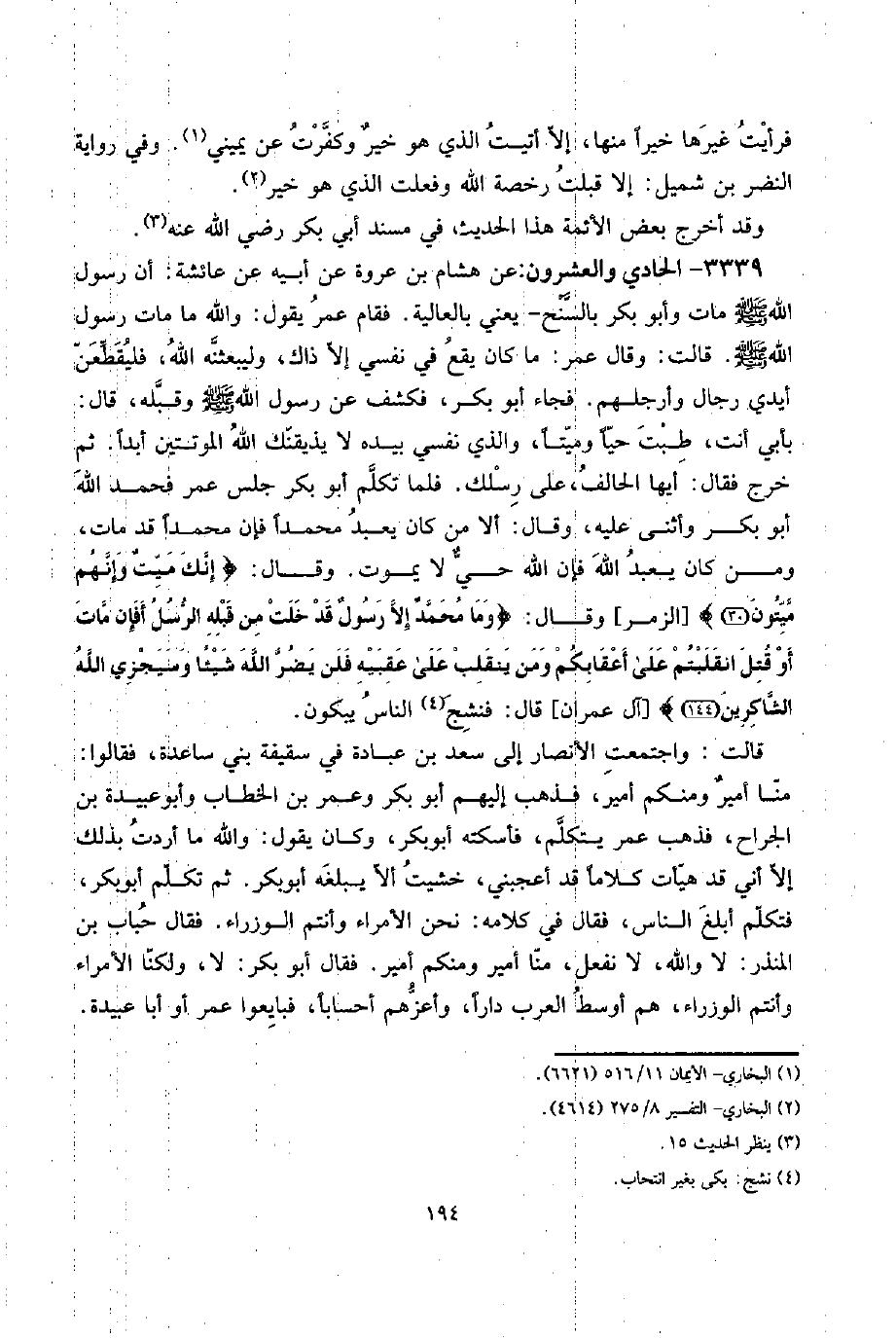 3339 - الْحَادِي وَالْعشْرُونَ: عَن هِشَام بن عُرْوَة عَن أَبِيه عَن عَائِشَة: أَن رَسُول الله صلى الله عَلَيْهِ وَسلم مَاتَ وَأَبُو بكر بالسنح - يَعْنِي بِالْعَالِيَةِ. فَقَامَ عمر يَقُول: وَالله مَا مَاتَ رَسُول الله صلى الله عَلَيْهِ وَسلم. قَالَت: وَقَالَ عمر: مَا كَانَ يَقع فِي نَفسِي إِلَّا ذَاك، وليبعثنه الله، فليقطعن أَيدي رجال وأرجلهم. فجَاء أَبُو بكر، فكشف عَن رَسُول الله صلى الله عَلَيْهِ وَسلم وَقَبله، قَالَ: بِأبي أَنْت، طبت حَيا وَمَيتًا، وَالَّذِي نَفسِي بِيَدِهِ لَا يذيقنك الله الموتتين أبدا. ثمَّ خرج فَقَالَ: أَيهَا الْحَالِف، على رسلك. فَلَمَّا تكلم أَبُو بكر جلس عمر فَحَمدَ الله أَبُو بكر وَأثْنى عَلَيْهِ، وَقَالَ: أَلا من كَانَ يعبد مُحَمَّدًا فَإِن مُحَمَّدًا قد مَاتَ، وَمن كَانَ يعبد الله فَإِن الله حيٌّ لَا يَمُوت. وَقَالَ: {إِنَّك ميت وَإِنَّهُم ميتون} [الزمر] وَقَالَ: {وَمَا مُحَمَّد إِلَّا رَسُول قد خلت من قبله الرُّسُل أَفَإِن مَاتَ أَو قتل انقلبتم على أعقابكم وَمن يَنْقَلِب على عَقِبَيْهِ فَلَنْ يضر الله شَيْئا وسيجزي الله الشَّاكِرِينَ} [آل عمرَان] قَالَ: فنشج النَّاس يَبْكُونَ.