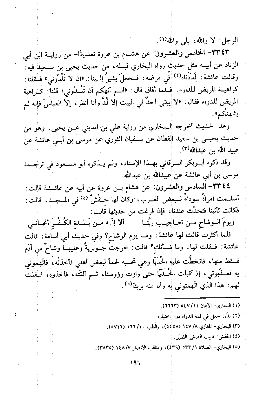 3343 - الْخَامِس وَالْعشْرُونَ: عَن هِشَام بن عُرْوَة تَعْلِيقا - من رِوَايَة ابْن أبي الزِّنَاد عَن أَبِيه مثل حديثٍ رَوَاهُ البُخَارِيّ قبله، من حَدِيث يحيى بن سعيد فِيهِ: وَقَالَت عَائِشَة: لددناه فِي مَرضه، فَجعل يُشِير إِلَيْنَا: " أَن لَا تلدوني " فَقُلْنَا: كَرَاهِيَة الْمَرِيض للدواء. فَلَمَّا أَفَاق قَالَ: " ألم أنهكم أَن تلدوني " قُلْنَا: كَرَاهِيَة الْمَرِيض للدواء فَقَالَ: " لَا يبْقى أحدٌ فِي الْبَيْت إِلَّا لد وَأَنا أنظر، إِلَّا الْعَبَّاس فَإِنَّهُ لم يشهدكم ".