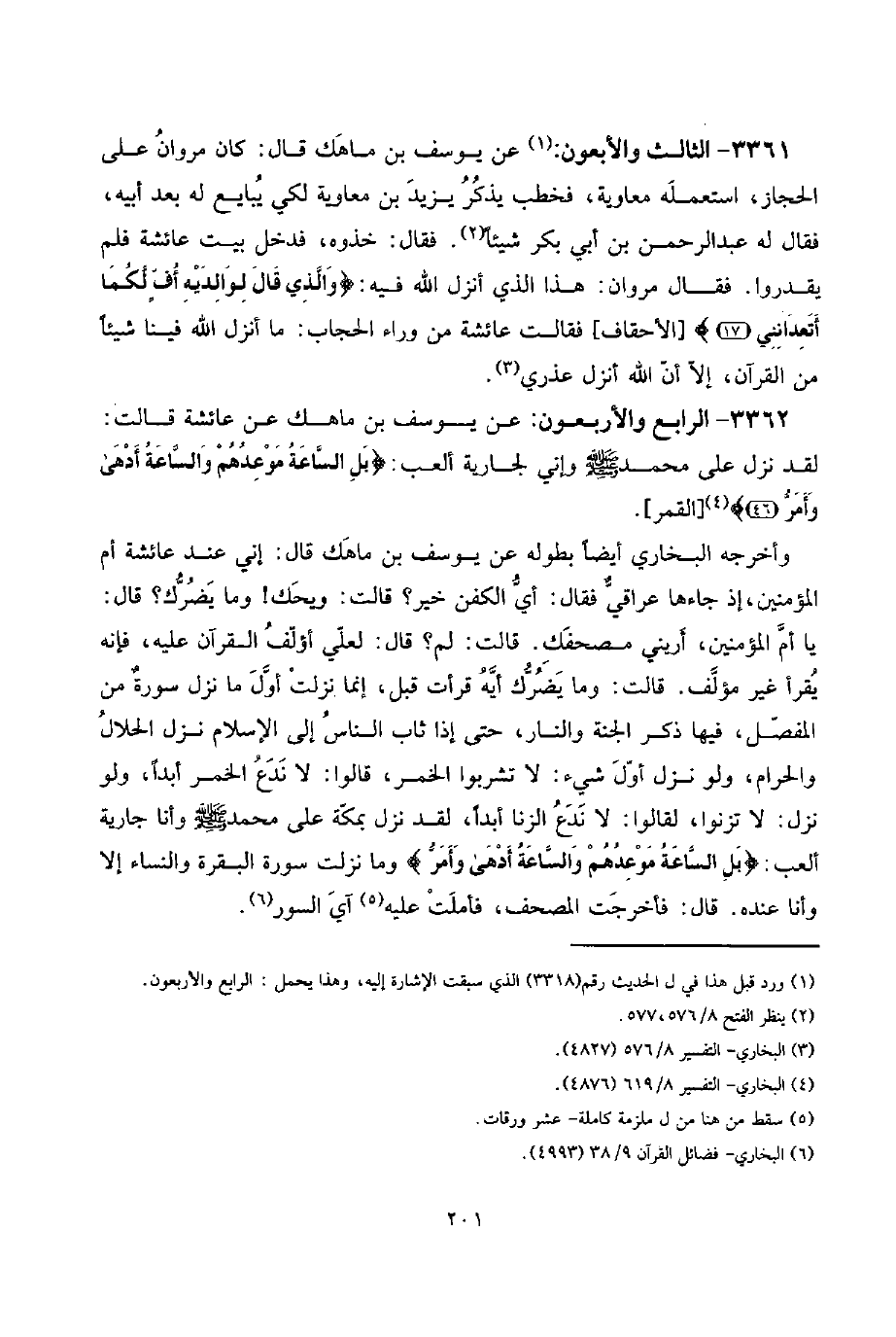 3361 - الثَّالِث وَالْأَرْبَعُونَ: عَن يُوسُف بن مَاهك قَالَ: كَانَ مَرْوَان على الْحجاز، اسْتَعْملهُ مُعَاوِيَة، فَخَطب يذكر يزِيد بن مُعَاوِيَة لكَي يُبَايع لَهُ بعد أَبِيه، فَقَالَ لَهُ عبد الرَّحْمَن بن أبي بكر شَيْئا. فَقَالَ: خذوه، فَدخل بَيت عَائِشَة فَلم يقدروا. فَقَالَ مَرْوَان: هَذَا الَّذِي أنزل الله فِيهِ: {وَالَّذِي قَالَ لوَالِديهِ أُفٍّ لَكمَا أتعدانني} [الْأَحْقَاف] فَقَالَت عَائِشَة من وَرَاء الْحجاب: مَا أنزل الله فِينَا شَيْئا من الْقُرْآن، إِلَّا أَن الله أنزل عُذْري.