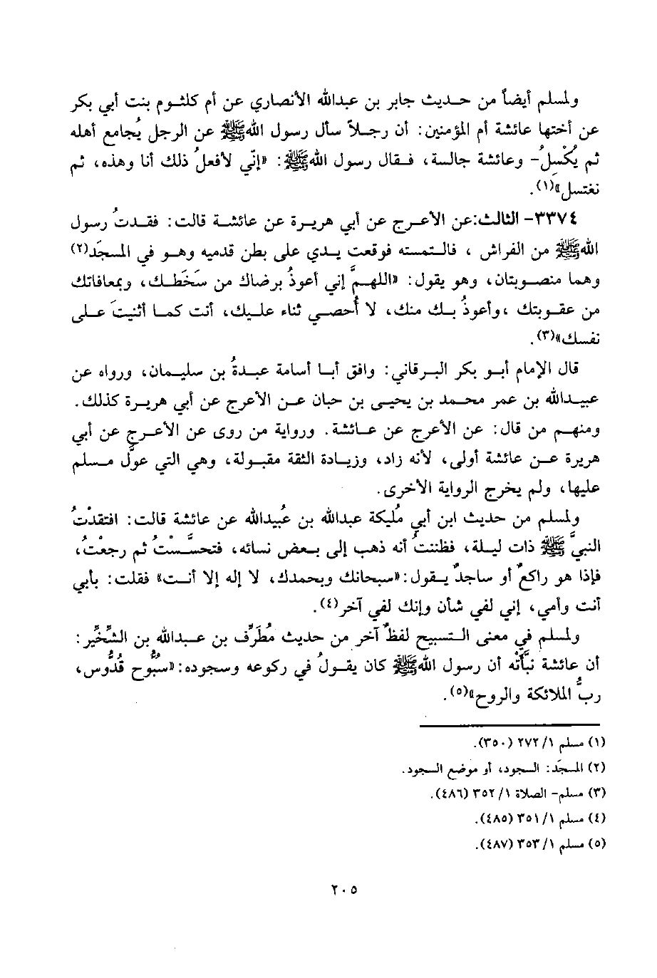 3374 - الثَّالِث: عَن الْأَعْرَج عَن أبي هُرَيْرَة عَن عَائِشَة قَالَت: فقدت رَسُول الله صلى الله عَلَيْهِ وَسلم من الْفراش، فالتمسته فَوَقَعت يَدي على بطن قَدَمَيْهِ وَهُوَ فِي الْمَسْجِد وهما منصوبتان، وَهُوَ يَقُول: " اللَّهُمَّ إِنِّي أعوذ برضاك من سخطك، وبمعافاتك من عُقُوبَتك، وَأَعُوذ بك مِنْك، لَا أحصي ثَنَاء عَلَيْك، أَنْت كَمَا أثنيت على نَفسك ".