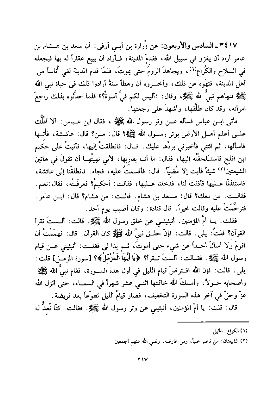 3417 - السَّادِس وَالْأَرْبَعُونَ: عَن زُرَارَة بن أبي أوفى: أَن سعد بن هِشَام بن عَامر أَرَادَ أَن يَغْزُو فِي سَبِيل الله، فَقدم الْمَدِينَة، فَأَرَادَ أَن يَبِيع عقارا لَهُ بهَا فَيَجْعَلهُ فِي السِّلَاح والكراع، ويجاهد الرّوم حَتَّى يَمُوت، فَلَمَّا قدم الْمَدِينَة لَقِي أُنَاسًا من أهل الْمَدِينَة، فنهوه عَن ذَلِك، وَأَخْبرُوهُ أَن رهطاً سِتَّة أَرَادوا ذَلِك فِي حَيَاة نَبِي الله صلى الله عَلَيْهِ وَسلم فنهاهم نَبِي الله صلى الله عَلَيْهِ وَسلم، وَقَالَ: " أَلَيْسَ لكم فِي أسوةٌ؟ " فَلَمَّا حدثوه بذلك رَاجع امْرَأَته، وَقد كَانَ طَلقهَا، وَأشْهد على رَجعتهَا.