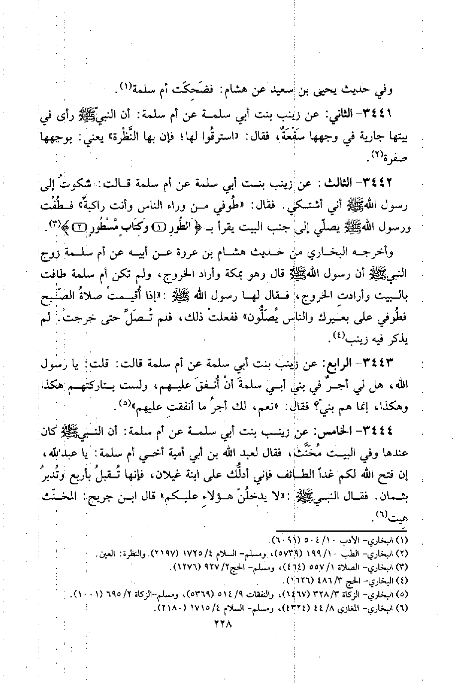 3444 - الْخَامِس: عَن زَيْنَب بنت أبي سَلمَة عَن أم سَلمَة: أَن النَّبِي صلى الله عَلَيْهِ وَسلم كَانَ عِنْدهَا وَفِي الْبَيْت مخنث، فَقَالَ لعبد الله بن أبي أُميَّة أخي أم سَلمَة: يَا عبد الله، إِن فتح الله لكم غَدا الطَّائِف فَإِنِّي أدلك على ابْنة غيلَان، فَإِنَّهَا تقبل بِأَرْبَع وتدبر بثمان. فَقَالَ النَّبِي صلى الله عَلَيْهِ وَسلم: " لَا يدخلن هَؤُلَاءِ عَلَيْكُم " قَالَ ابْن جريج: المخنث هيت.