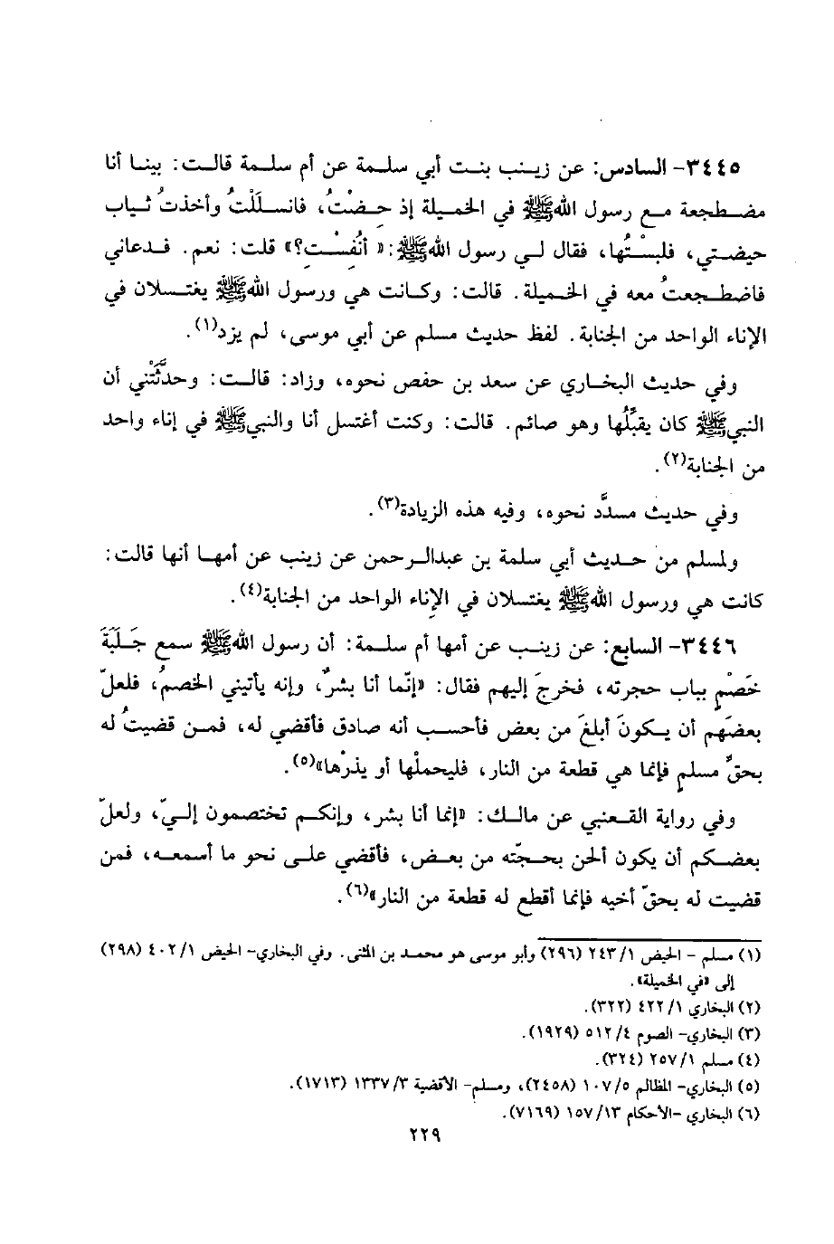 3445 - السَّادِس: عَن زَيْنَب بنت أبي سَلمَة عَن أم سَلمَة قَالَت: بَينا أَنا مُضْطَجِعَة مَعَ رَسُول الله صلى الله عَلَيْهِ وَسلم فِي الخميلة إِذْ حِضْت، فانسللت وَأخذت ثِيَاب حيضتي، فلبستها، فَقَالَ لي رَسُول الله صلى الله عَلَيْهِ وَسلم: " أنفست؟ " قلت: نعم. فدعاني فاضطجعت مَعَه فِي الخميلة. قَالَت: وَكَانَت هِيَ وَرَسُول الله صلى الله عَلَيْهِ وَسلم يغتسلان فِي الْإِنَاء الْوَاحِد من الْجَنَابَة. لفظ حَدِيث مُسلم عَن أبي مُوسَى، لم يزدْ.