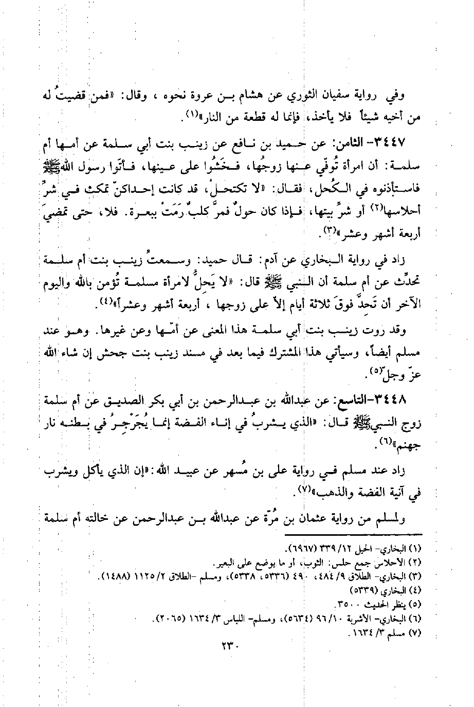 3447 - الثَّامِن: عَن حميد بن نَافِع عَن زَيْنَب بنت أبي سَلمَة عَن أمهَا أم سَلمَة: أَن امْرَأَة توفّي عَنْهَا زَوجهَا، فخشوا على عينهَا، فَأتوا رَسُول الله صلى الله عَلَيْهِ وَسلم فاستأذنوه فِي الْكحل، فَقَالَ: " لَا تكتحل، قد كَانَت إحداكن تمكث فِي شَرّ أحلاسها أَو شَرّ بَيتهَا، فَإِذا كَانَ حولٌ فَمر كلبٌ رمت ببعرة. فَلَا، حَتَّى تمْضِي أَرْبَعَة أشهر وَعشر ".