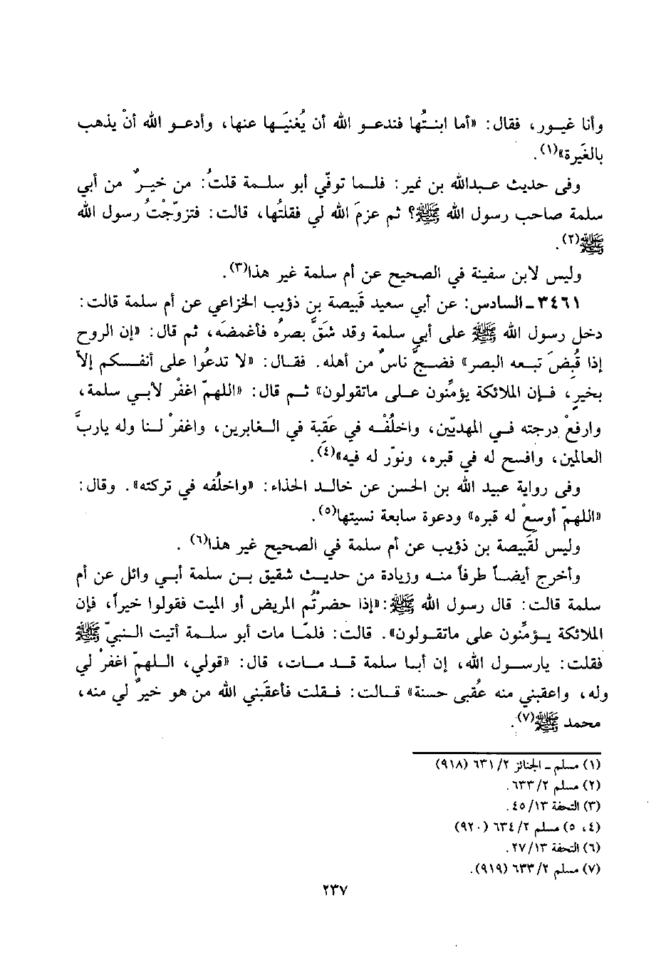 3461 - السَّادِس: عَن أبي سعيد قبيصَة بن ذُؤَيْب الْخُزَاعِيّ عَن أم سَلمَة قَالَت: دخل رَسُول الله صلى الله عَلَيْهِ وَسلم على أبي سَلمَة وَقد شقّ بَصَره فأغمضه، ثمَّ قَالَ: " إِن الرّوح إِذا قبض تبعه الْبَصَر " فَضَجَّ ناسٌ من أَهله. فَقَالَ: " لَا تدعوا على أَنفسكُم إِلَّا بخيرٍ، فَإِن الْمَلَائِكَة يُؤمنُونَ على مَا تَقولُونَ " ثمَّ قَالَ: " اللَّهُمَّ اغْفِر لأبي سَلمَة، وارفع دَرَجَته فِي المهديين، واخلفه فِي عقبَة فِي الغابرين، واغفر لنا وَله يَا رب الْعَالمين، وافسح لَهُ فِي قَبره، وَنور لَهُ فِيهِ ".