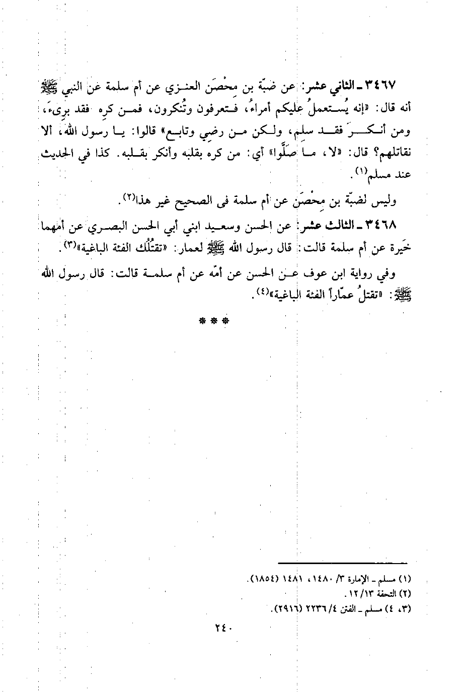3467 - الثَّانِي عشر: عَن ضبة بن مُحصن الْعَنزي عَن أم سَلمَة عَن النَّبِي صلى الله عَلَيْهِ وَسلم أَنه قَالَ: " إِنَّه يسْتَعْمل عَلَيْكُم أُمَرَاء، فتعرفون وتنكرون فَمن كره فقد برِئ، وَمن أنكر فقد سلم، وَلَكِن من رَضِي وتابع " قَالُوا: يَا رَسُول الله، أَلا نقاتلهم؟ قَالَ: " لَا، مَا صلوا " أَي: من كره بِقَلْبِه وَأنكر بِقَلْبِه. كَذَا فِي الحَدِيث عِنْد مُسلم.