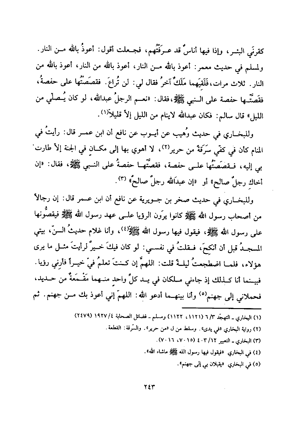 أعوذ بِاللَّه من النَّار، أعوذ بِاللَّه من النَّار، أعوذ بِاللَّه من النَّار. ثَلَاث مَرَّات، فلقيهما ملكٌ آخر فَقَالَ لي: لن تراع. فقصصتها على حَفْصَة، فقصتها حَفْصَة على النَّبِي صلى الله عَلَيْهِ وَسلم، فَقَالَ: " نعم الرجل عبد الله، لَو كَانَ يُصَلِّي من اللَّيْل " قَالَ سَالم: فَكَانَ عبد الله لَا ينَام من اللَّيْل إِلَّا قَلِيلا ".
