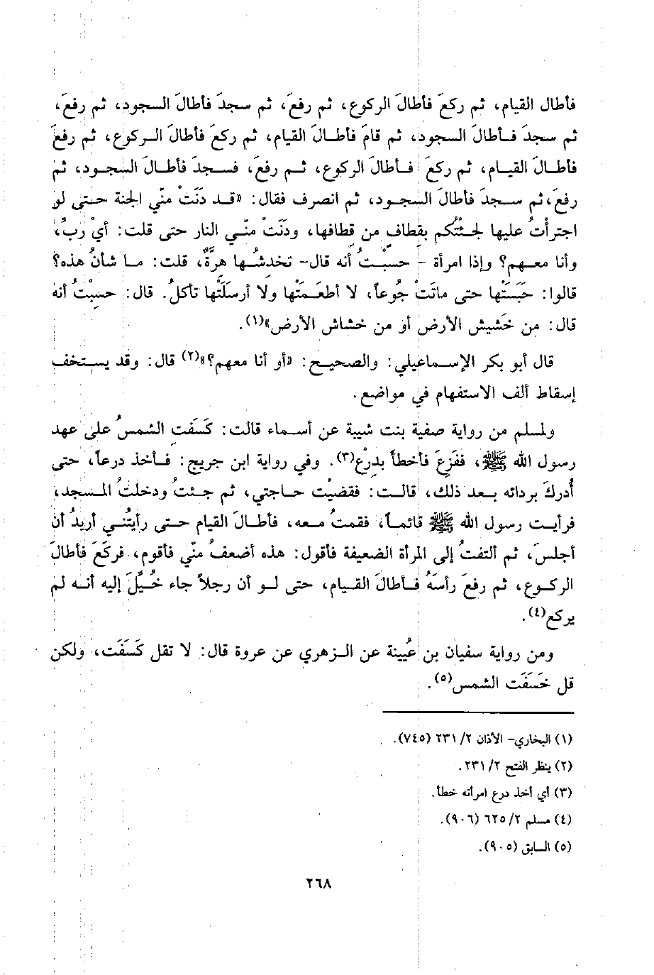 كسفت الشَّمْس على عهد رَسُول الله صلى الله عَلَيْهِ وَسلم، فَفَزعَ فَأَخْطَأَ بدرع. وَفِي رِوَايَة ابْن جريج: فَأخذ درعاً، حَتَّى أدْرك بردائه بعد ذَلِك، قَالَت: فَقضيت حَاجَتي، ثمَّ جِئْت وَدخلت الْمَسْجِد، فَرَأَيْت رَسُول الله صلى الله عَلَيْهِ وَسلم قَائِما، فَقُمْت مَعَه، فَأطَال الْقيام حَتَّى رَأَيْتنِي أُرِيد أَن أَجْلِس، ثمَّ ألتفت إِلَى الْمَرْأَة الضعيفة فَأَقُول: هَذِه أَضْعَف مني فأقوم، فَرَكَعَ فَأطَال الرُّكُوع، ثمَّ رفع رَأسه فَأطَال الْقيام، حَتَّى لَو أَن رجلا جَاءَ خيل إِلَيْهِ أَنه لم يرْكَع.