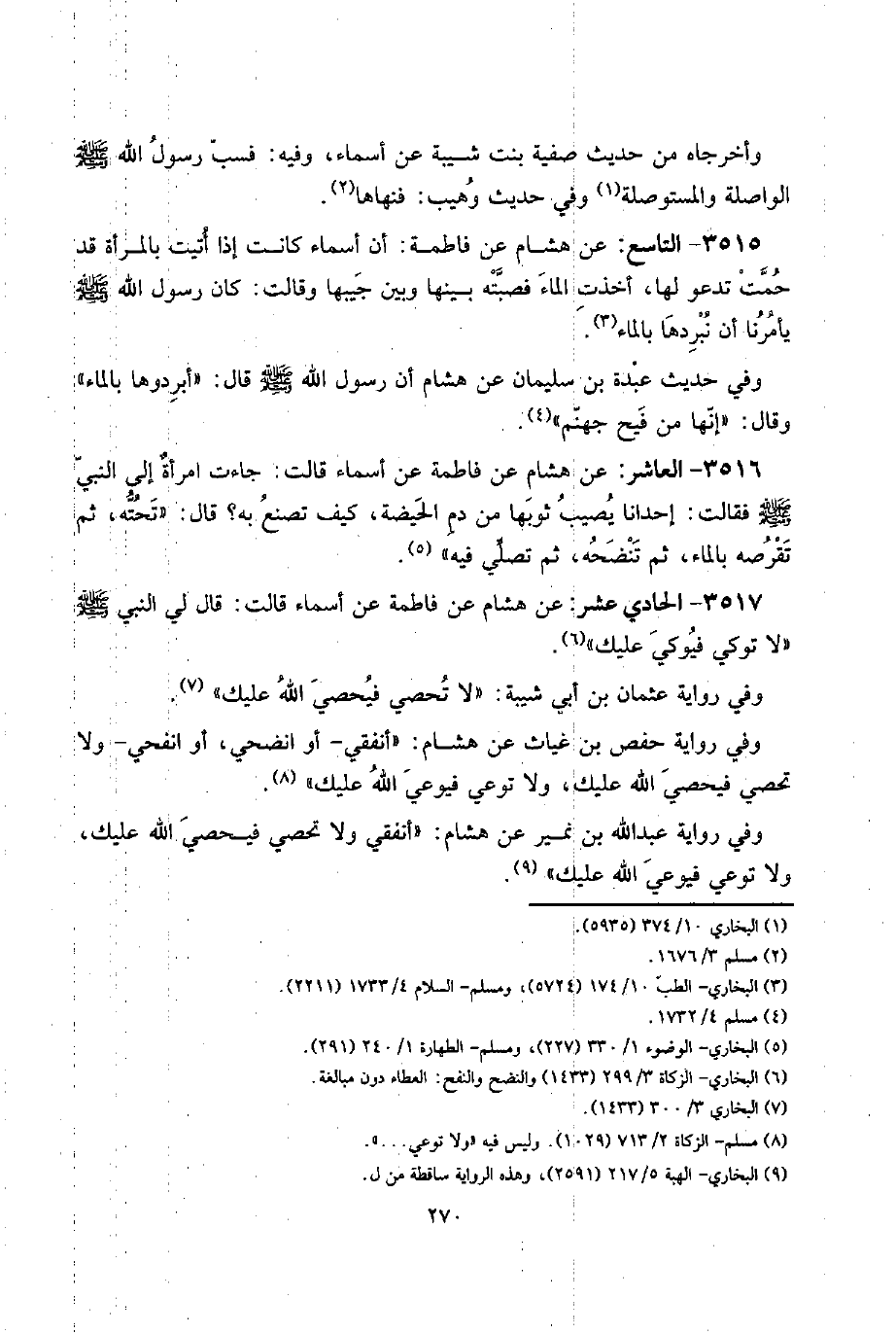 3517 - الْحَادِي عشر: عَن هِشَام عَن فَاطِمَة عَن أَسمَاء قَالَت: قَالَ لي النَّبِي صلى الله عَلَيْهِ وَسلم " لَا توكي فيوكي عَلَيْك ".
