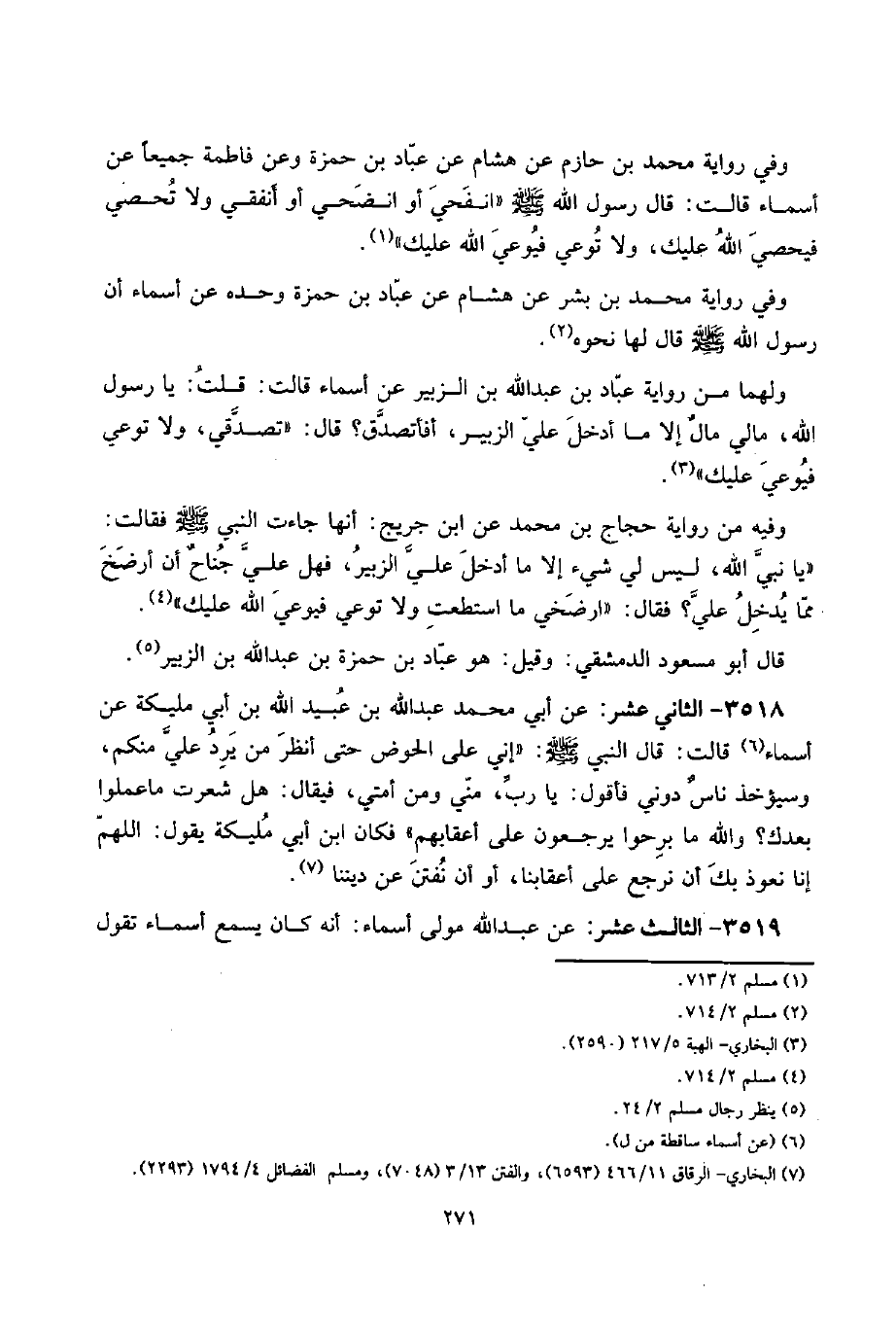 أَنَّهَا جَاءَت النَّبِي صلى الله عَلَيْهِ وَسلم فَقَالَت: " يَا نَبِي الله، لَيْسَ لي شَيْء إِلَّا مَا أَدخل عَليّ الزبير، فَهَل عَليّ جناحٌ أَن أرضخ مِمَّا يدْخل عَليّ؟ فَقَالَ: " ارضخي مَا اسْتَطَعْت وَلَا توعي فيوعي الله عَلَيْك ".
