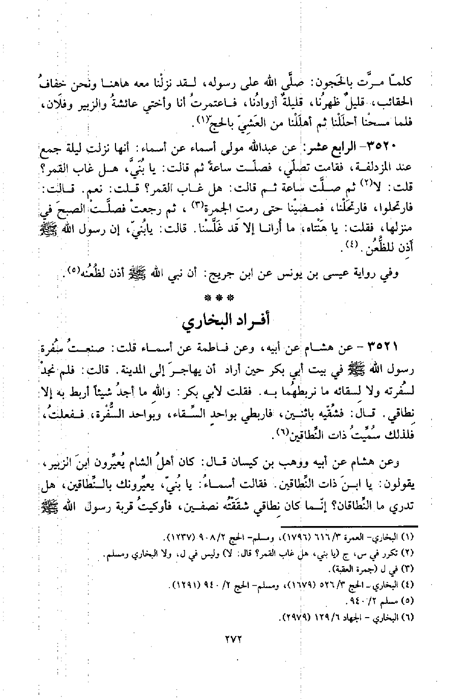 3521 - عَن هِشَام عَن أَبِيه، وَعَن فَاطِمَة عَن أَسمَاء قلت: صنعت سفرة رَسُول الله صلى الله عَلَيْهِ وَسلم فِي بَيت أبي بكر حِين أَرَادَ أَن يُهَاجر إِلَى الْمَدِينَة. قَالَت: فَلم نجد لسفرته وَلَا لسقائه مَا نربطهما بِهِ. فَقلت لأبي بكر: وَالله مَا أجد شَيْئا أربط بِهِ إِلَّا نطاقي. قَالَ: فشقيه بِاثْنَيْنِ، فاربطي بواحدٍ السقاء، وبواحد السفرة، فَفعلت، فَلذَلِك سميت ذَات النطاقين.